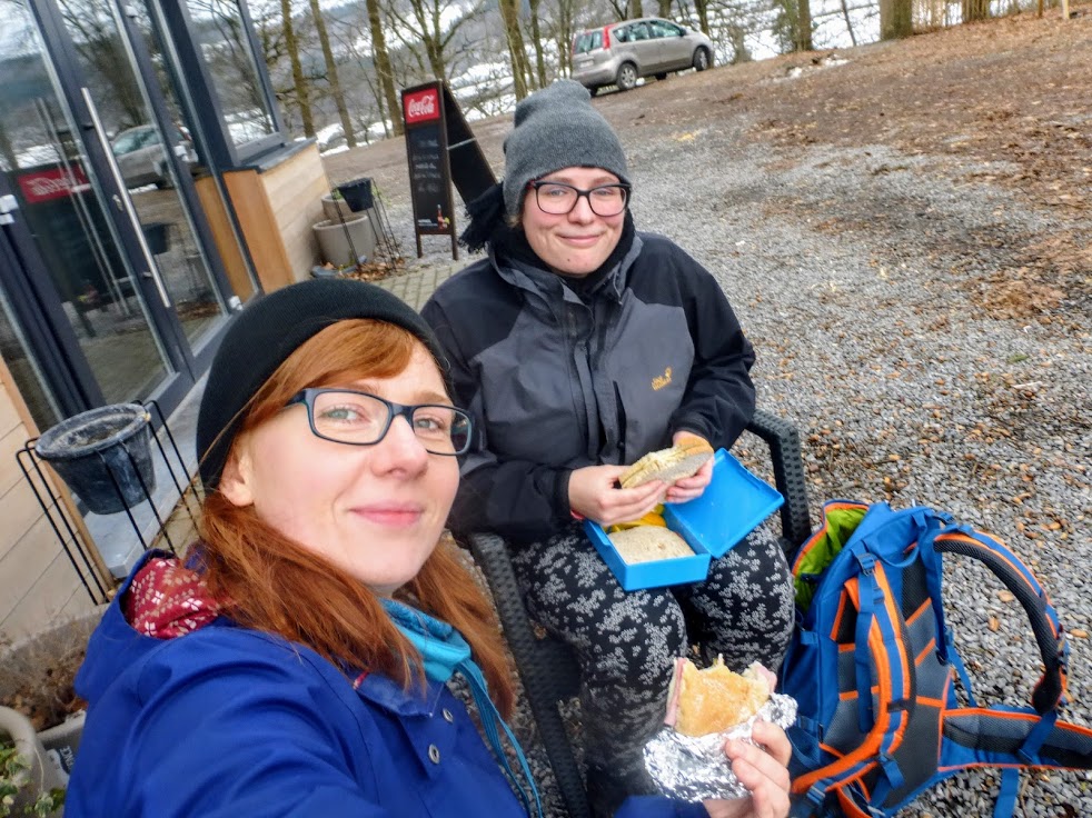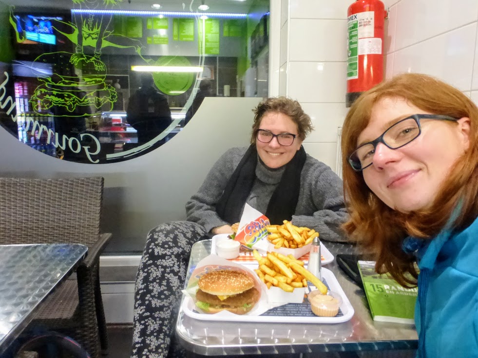Jestem dozgonnie wdzięczna tej miłej kobiecie, o której wiem tylko tyle, że zbiera szkło i mieszka w Tiège. W Spa, w oczekiwaniu na pociąg, pożarłyśmy dużo jedzenia i zafundowałyśmy sobie plenerową sesję zdjęciową na dworcu. Tak wyglądają ludzie, którzy doświadczyli musu mozołu na własnej skórze: