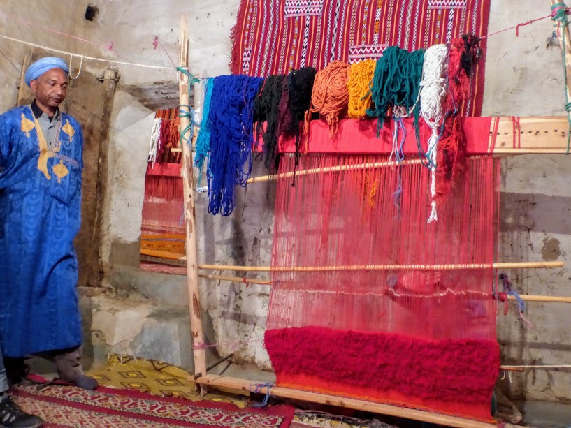 Wkrótce docieramy do berberyskiej wioski Tamtatouchte, gdzie przechadzamy się pomiędzy polami i oglądamy ludzi, którzy pracują w swoich ogródkach. Przewodnik opowiadał, co i jak uprawiają ludzie na swoich małych poletkach. Potem wzięliśmy udział w „prezentacji dywanów”. W wiosce pracują kobiety (jeśli dobrze pamiętam, jest ich 25), które tkają dywany, a przewodnik i jedna z pań próbowali przybliżyć nam nieco tajniki tej sztuki. Zostaliśmy poczęstowani herbatą, a następnie rozpoczęła się część właściwa prezentacji, czyli zachęcanie do zakupu. Nie powiem, dywany były genialne, chętnie bym sobie taki sprawiła, ale jednak, mimo wszystko, wolę za te pieniądze kupić następny bilet lotniczy 🙂