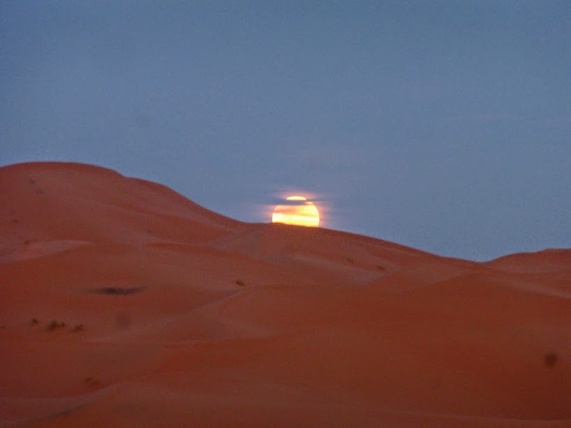 Po kolacji w namiocie (ryż z warzywami i nieśmiertelny tadżin) wróciłyśmy na naszą wydmę, żeby napawać się ciszą, pełnią księżyca i rozgwieżdżonym niebem. Szybko dołączył do nas miły Berber Hammed, który przyniósł ze sobą koc i zabawiał nas pogawędką. Opowiadał nam m.in. o zwierzętach, jakie żyją na pustyni (mi wystarczyło, że widziałam wielkiego skarabeusza i salamandrę), o turystach, którzy gubili się na pustyni, a także tłumaczył, na jakie gwiazdozbiory patrzymy. Mógłby tak zapewne siedzieć z nami całą noc, gdyby nie to, że zerwał się zimny wiatr i stwierdziłyśmy, że idziemy spać.