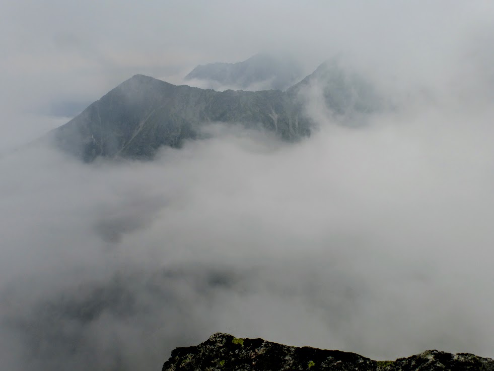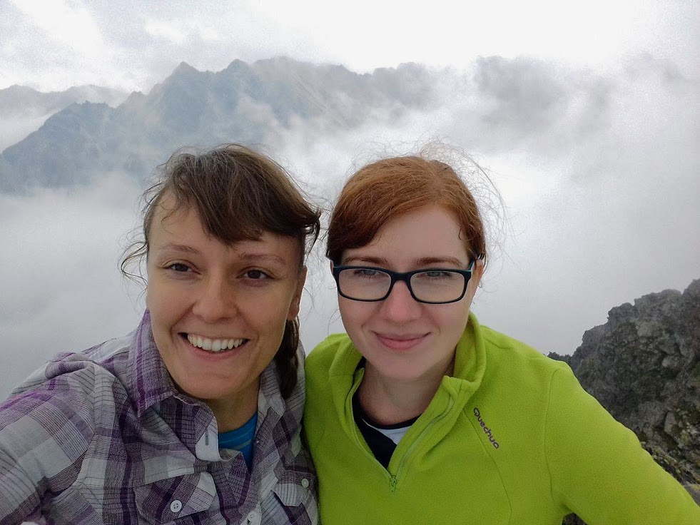 No i w końcu jest! Szczyt wyłania się dość nieoczekiwanie. Jest wąsko i podejrzewamy, że zarówno z lewej jak i z prawej strony zieje przepaść, ale mgła skutecznie ukrywa ten fakt. Zajmujemy miejscówki w pierwszym rzędzie i podziwiamy spektakl pod tytułem W królestwie mgieł. Absolutna cisza, nieco mroczna, mglista atmosfera i satysfakcja, że udało się tu wleźć. Spędzamy na szczycie dobrych kilkadziesiąt minut, bo czas nas nie goni.