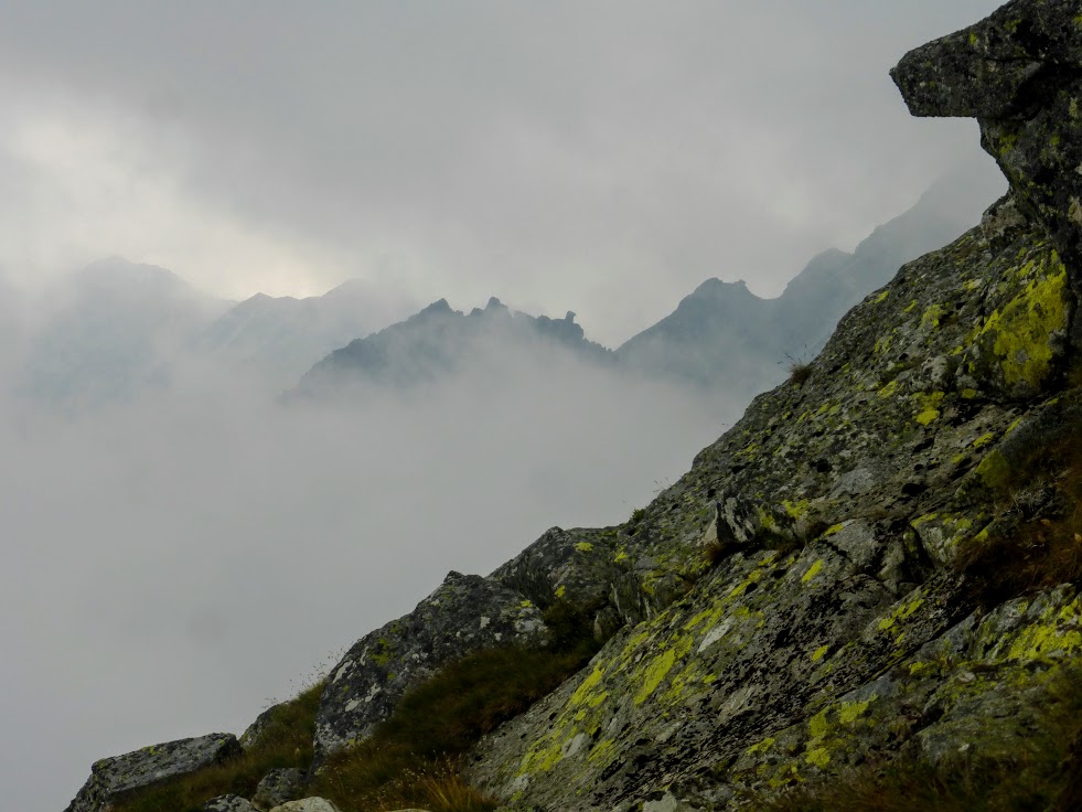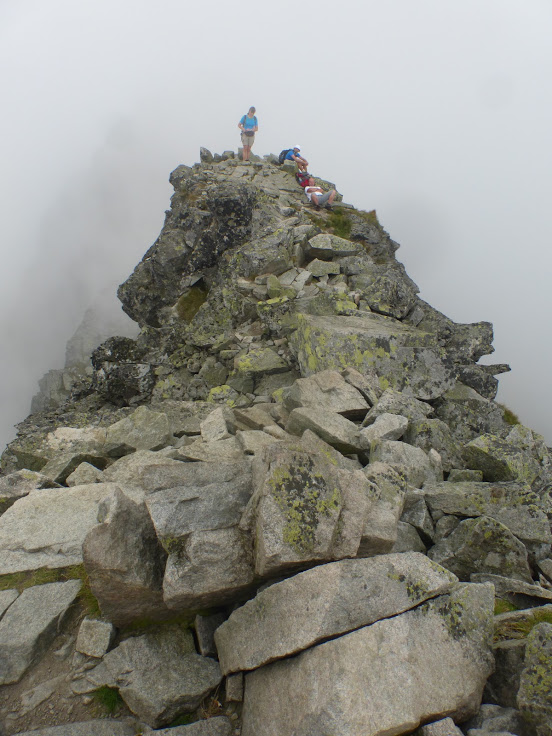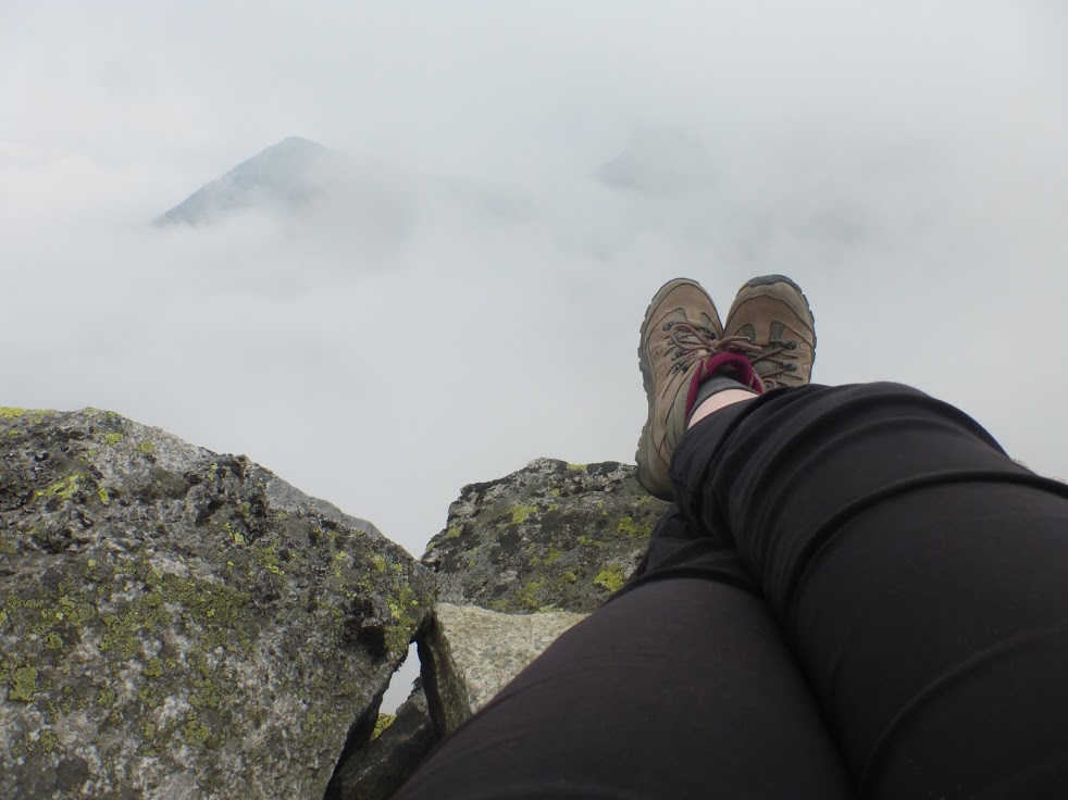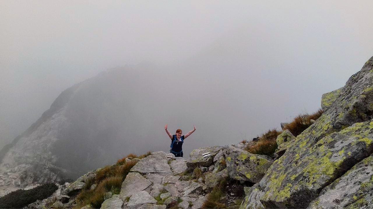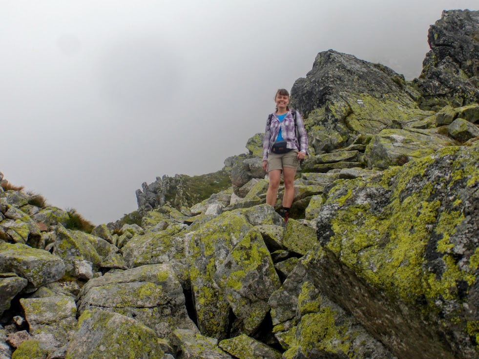 Krok za krokiem, czujemy, że zbliżamy się do szczytu, no bo ile można iść. Spacerujemy po wielkich kamieniach, mgła czasem zasłania wszystko dookoła, a czasem łaskawie odkrywa to i owo. Trudno jest mi ocenić, czy szlak wiedzie na przykład skrajem przepaści, bo zamiast przepaści widziałam mgłę. Dla tych, co mają różnego rodzaju lęki wysokościowe, wędrówka we mgle to chyba całkiem niegłupie rozwiązanie 🙂