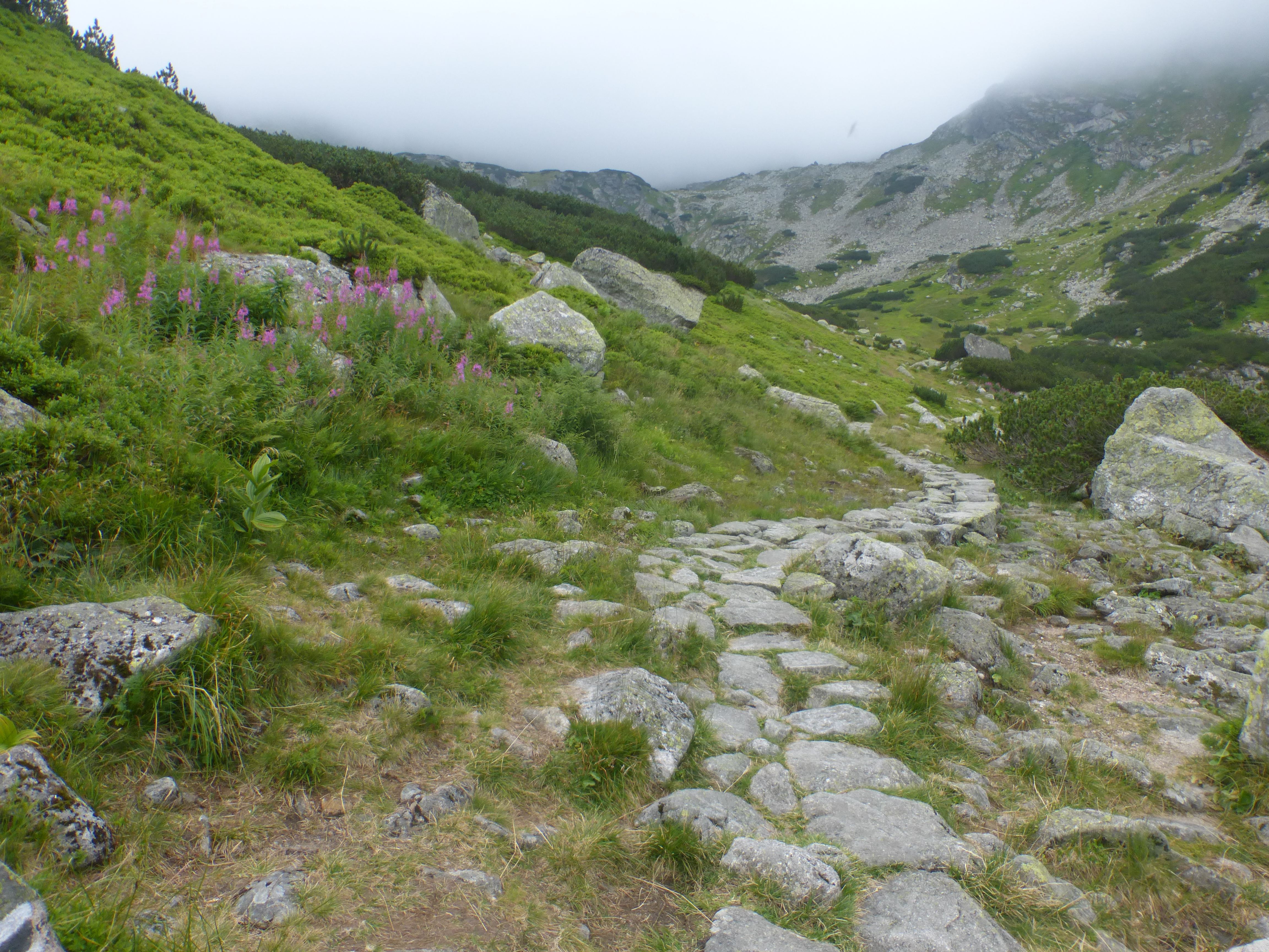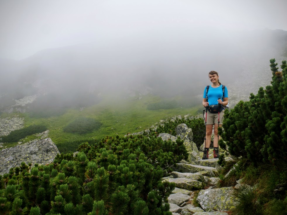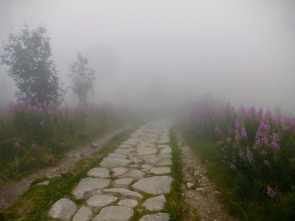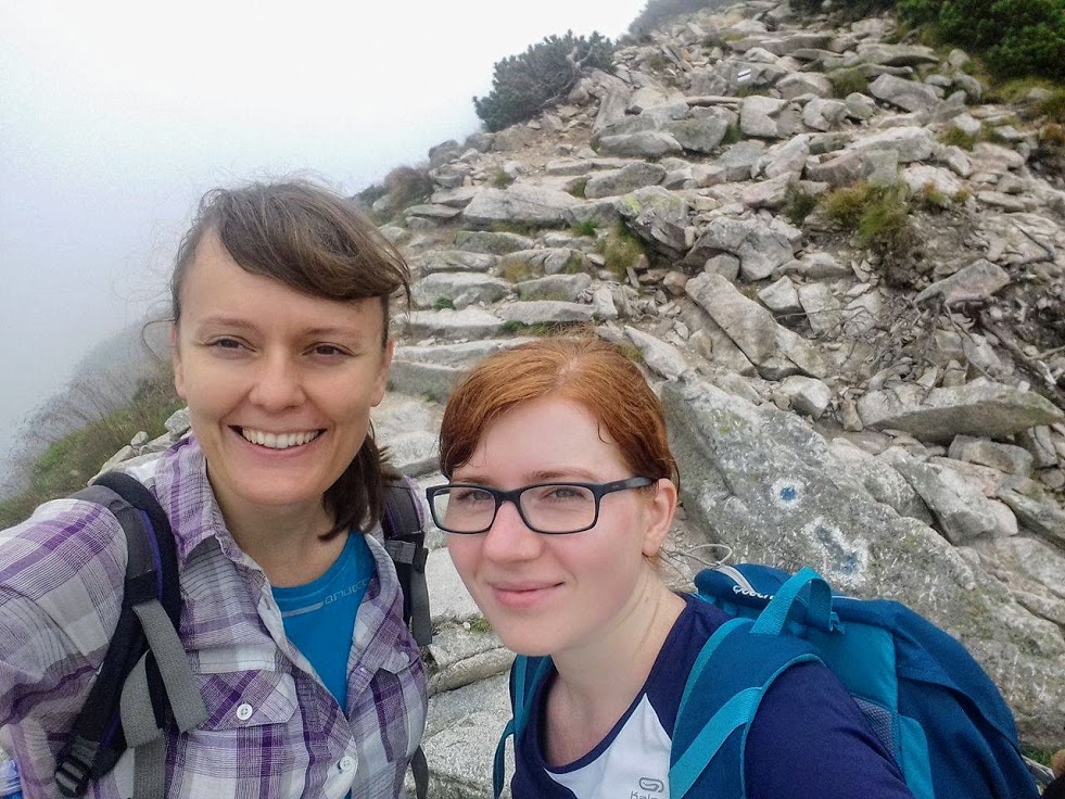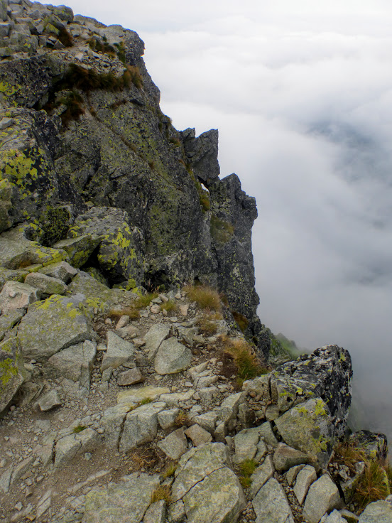 Krok za krokiem, czujemy, że zbliżamy się do szczytu, no bo ile można iść. Spacerujemy po wielkich kamieniach, mgła czasem zasłania wszystko dookoła, a czasem łaskawie odkrywa to i owo. Trudno jest mi ocenić, czy szlak wiedzie na przykład skrajem przepaści, bo zamiast przepaści widziałam mgłę. Dla tych, co mają różnego rodzaju lęki wysokościowe, wędrówka we mgle to chyba całkiem niegłupie rozwiązanie 🙂