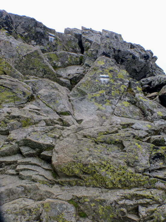 Potem tego typu przygód już nie ma. Nie znaczy to, że jest całkiem łatwo – są kolejne skalne ściany, na które trzeba się wdrapać, ale żadna z nich nie dostarcza mi tylu wrażeń, co ta pierwsza. Szlak prowadzi też przez pochyłe płyty skalne, które przy suchej pogodzie nie sprawiają większych trudności. Serdecznie dziękuję jednak za przyjemność wdrapywania się po tych płytach w deszczu.