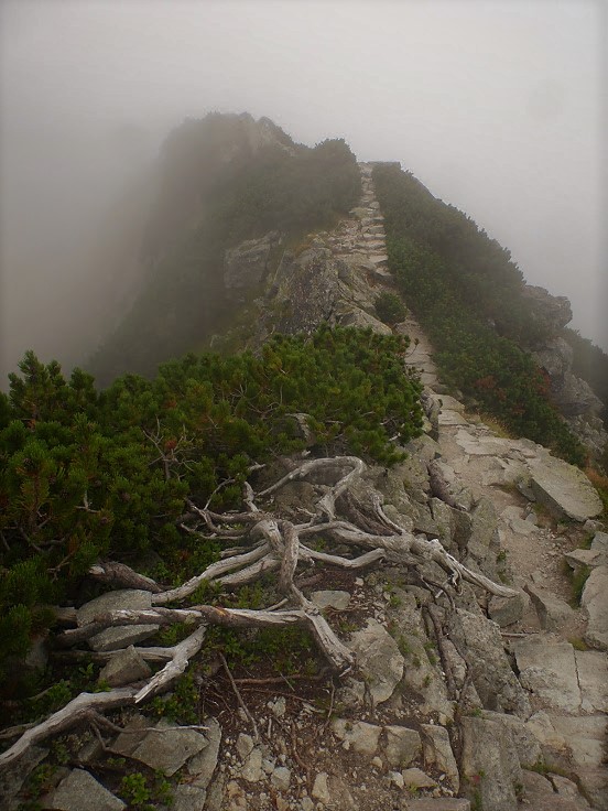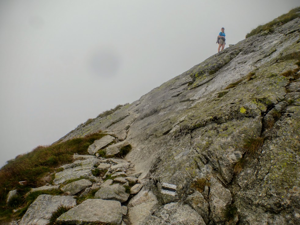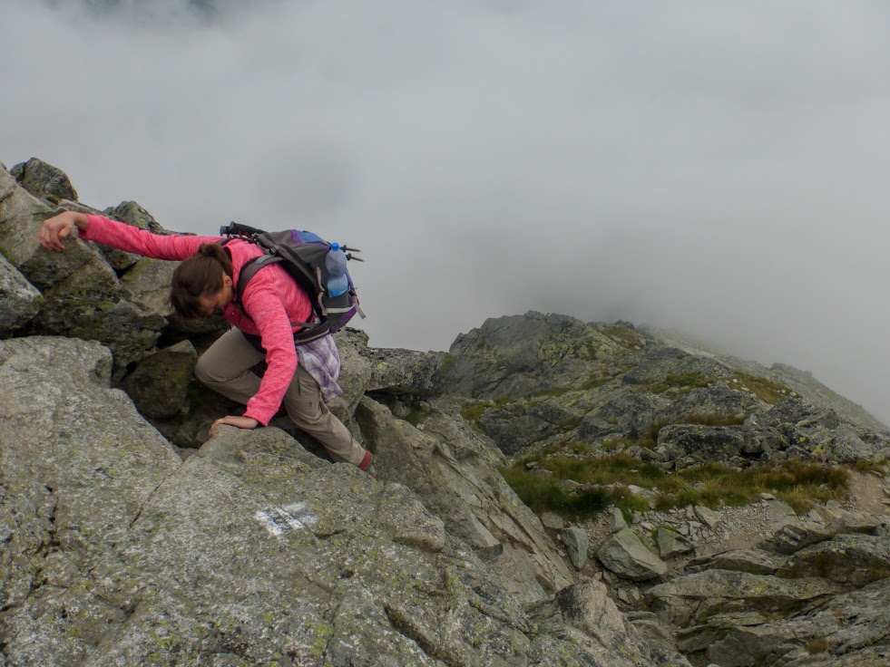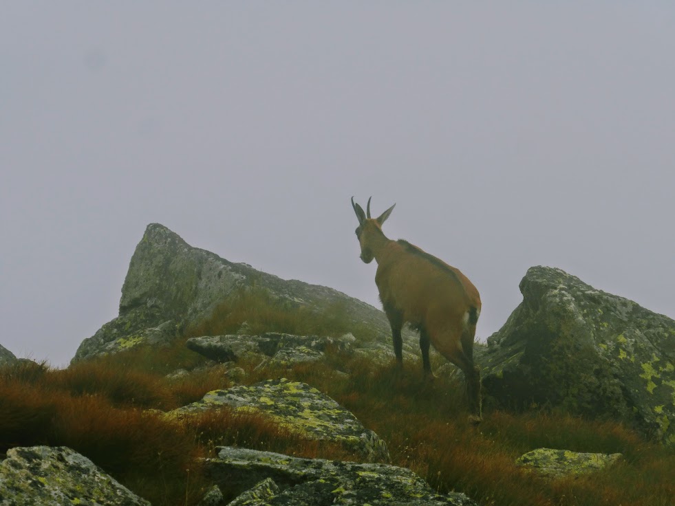 Na przełęczy robimy chwilę przerwy. Z góry schodzi akurat miła Pani, więc wypytujemy co i jak. Najważniejszą informacją, jaką wyławiamy jest fakt, że na górze czekają na nas kozice, a jedna z nich zrobiła siku 3 metry od tej pani. Lepszej zachęty nam nie potrzeba! Ruszamy we mgłę, początkowo bez żadnych trudności, po wygodnych schodkach. Podejście powinno trwać około 40 minut, ale idziemy niespiesznie, bo po co się spieszyć?