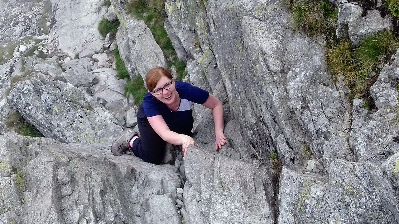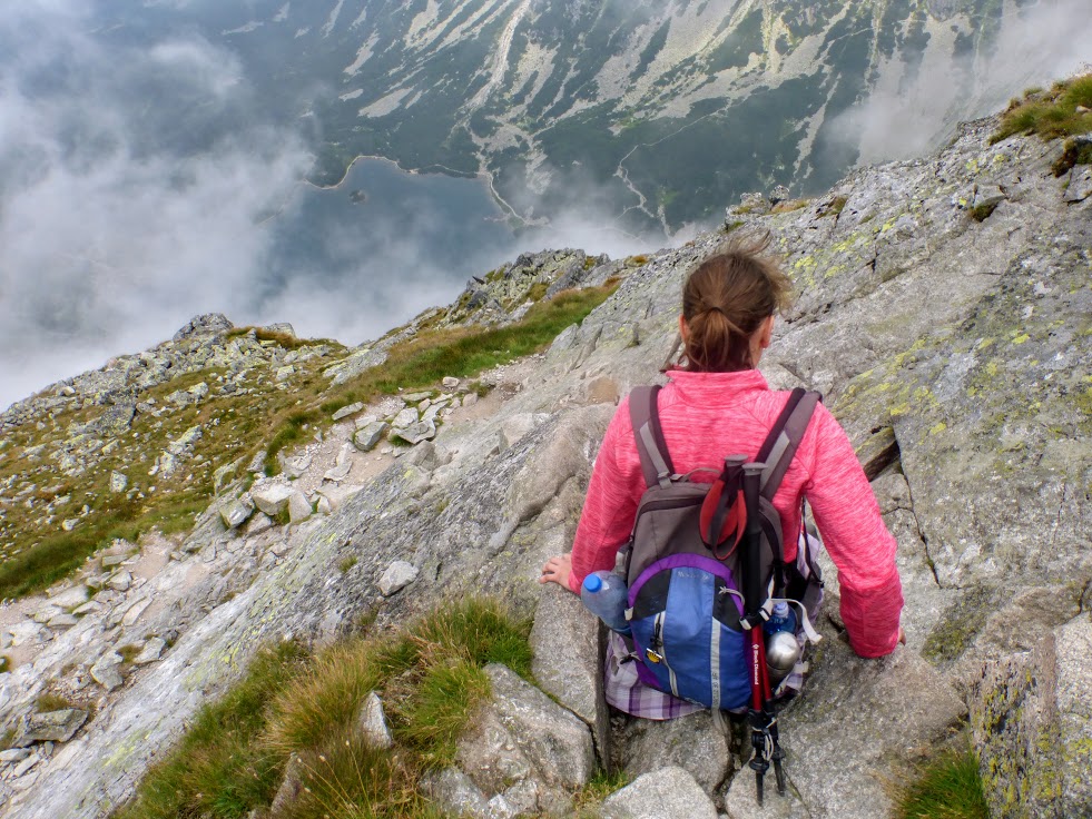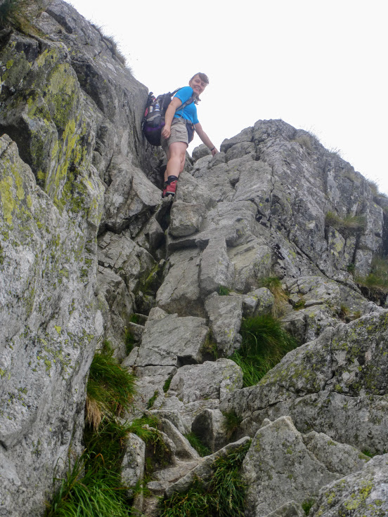 Kiedy już uporałyśmy się ze wszystkimi gwiazdorskimi obowiązkami, zakończyłyśmy sesje zdjęciowe, wyleżałyśmy się na zimnych kamieniach i wysmagał nas wiatr, nadeszło nieuniknione. Skoro się weszło, trzeba też zejść. Na próżno było szukać u mnie entuzjazmu, nie jestem fanką schodzenia z gór. Nie bardzo miałam jednak wyjście, więc wzięłam się w garść i zlazłam. I wiecie co? Było dużo łatwiej niż przypuszczałam. Nawet ta pierwsza, straszna przeszkoda, której obawiałam się najbardziej, przy schodzeniu nie sprawiła mi większych trudności. Chyba po prostu Kościelec miał mnie serdecznie dość i postanowił zezwolić mi na możliwie szybkie opuszczenie szczytu. Dzięki, miła góro!