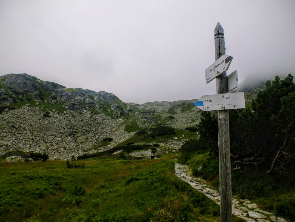Na przełęcz Karb docieramy przez Zieloną Dolinę Gąsienicową (a więc przy Murowańcu wybieramy szlak czarny, a potem niebieski). Zbyt dobrze pamiętam strome podejście na Karb od strony Czarnego Stawu Gąsienicowego, aby wybrać ten wariant szlaku. Idziemy więc wśród uroczych stawków, podziwiamy sielski krajobraz, a dopiero w końcowej fazie podejścia na przełęcz wypluwamy sobie płuca, bo jednak jest pod górę.