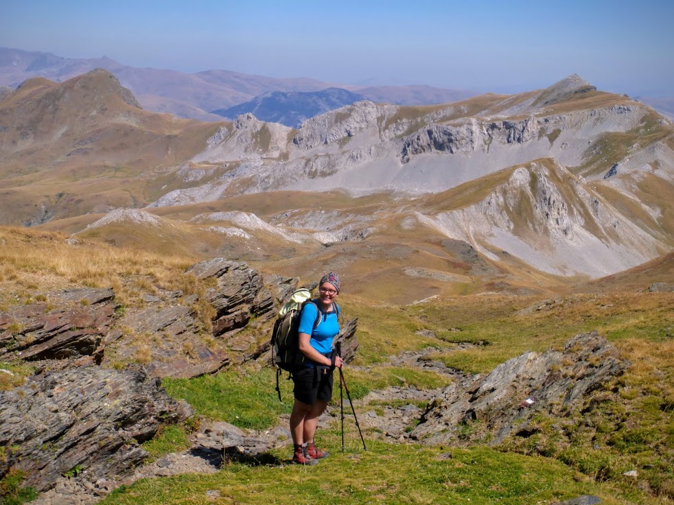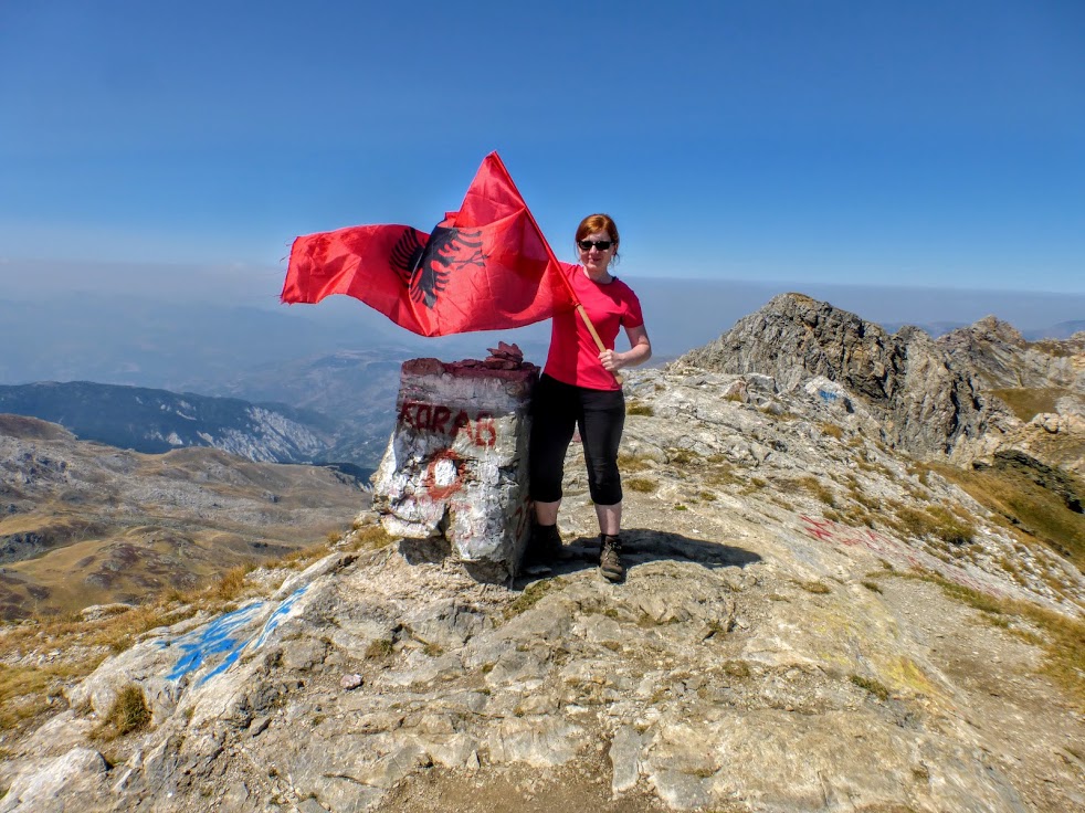 Na szczycie spędziłyśmy około godziny, najpierw pławiąc się w słońcu, potem robiąc sobie zdjęcia m.in. z flagą albańską. W końcu zaczęłyśmy niespiesznie schodzić. Było trochę po dwunastej, miałyśmy przed sobą cały piękny dzień. Korab zdobyty, teraz po prostu chłońmy piękno macedońskich gór.