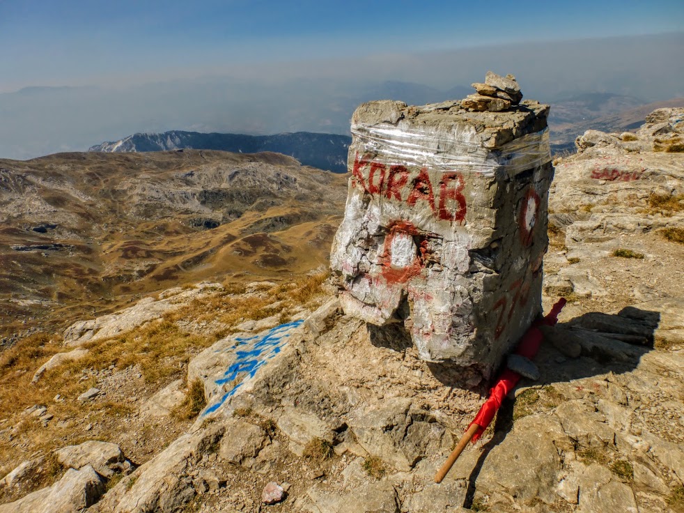 Wejście na Korab z bazy Strezimir powinno trwać około 4,5 godziny. Są tacy, co wchodzą w 3,5. My wchodziłyśmy 5,5. Mogłabym napisać, że z moją kondycją nie jest najlepiej, ale wolę utrzymywać, że musiałam przecież robić zdjęcia. No i wzdychać z zachwytu, bo sceneria była urzekająca. W pewnym momencie droga zaczęła nam się jednak trochę dłużyć – idziemy i idziemy, a Korabu jak nie było tak nie ma. Może to ta górka po lewej? Nie? No ale za tą przełęczą to już na pewno będzie to. Też nie? Szczyt jest dość niepozorny, nie wyróżnia się szczególnie, no ale w końcu wyłania się przed nami i pełne dumy stajemy na najwyższym wierzchołku Macedonii i Albanii.