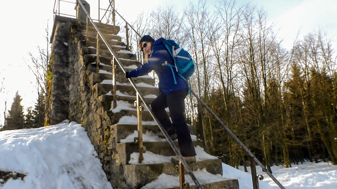 Spodziewaliśmy się, że oblodzone schody będą stanowiły nie lada wyzwanie, dlatego też przed samym atakiem szczytowym udaliśmy się do pobliskiej jadłodajni, aby posilić się belgijskimi frytkami. To był strzał w dziesiątkę. Ze wsparciem frytek zdobyliśmy upragniony szczyt, choć wierzcie – nie było łatwo. Gdyby nie poręczówki założone na drodze, nie byłoby mowy nawet o próbie wejścia. Zdradliwe podłoże, ekspozycja i mroźny wiatr nie ułatwiały zadania, ale to przestaje mieć jakiekolwiek znaczenie, gdy stoi się na szczycie w glorii chwały, jako Zimowy Zdobywca Korony Beneluksu!