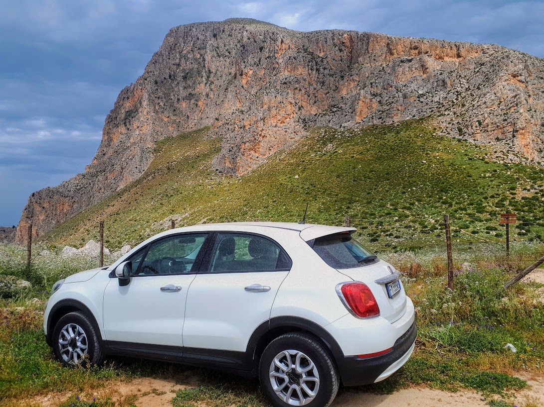 Na miejsce mozołu docieramy samochodem, naszym dzielnym i niezniszczalnym Fiatem 500 X, który bez zająknięcia znosił wszystkie nasze off-roadowe pomysły i nigdy nas nie zawiódł. Jedziemy z oddalonej o 15 km. miejscowości Castelluzo, gdzie nocowaliśmy w zdecydowanie godnym polecenia B&B La mia Isola (przesympatyczni właściciele, genialne śniadanie!). Dojeżdżamy na parking Parcheggio Pizzo Cofano, zostawiamy auto, bierzemy trzy głębokie oddechy i ruszamy na spotkanie z górą!