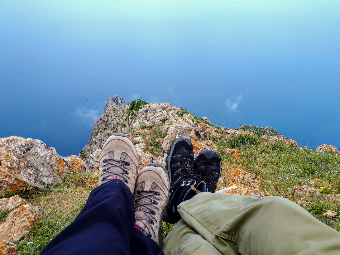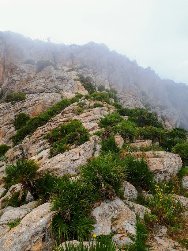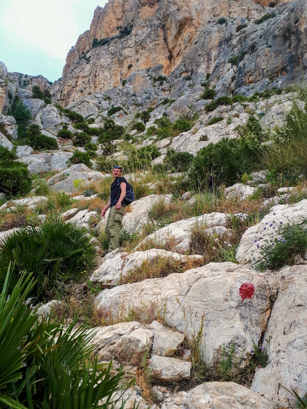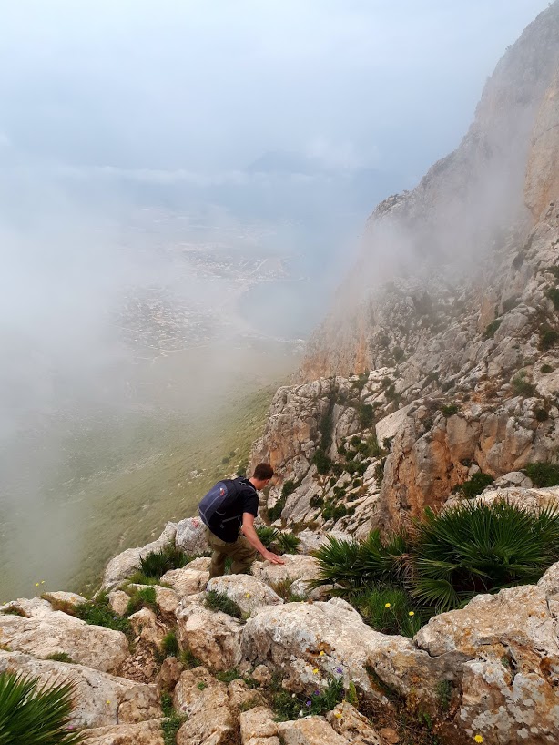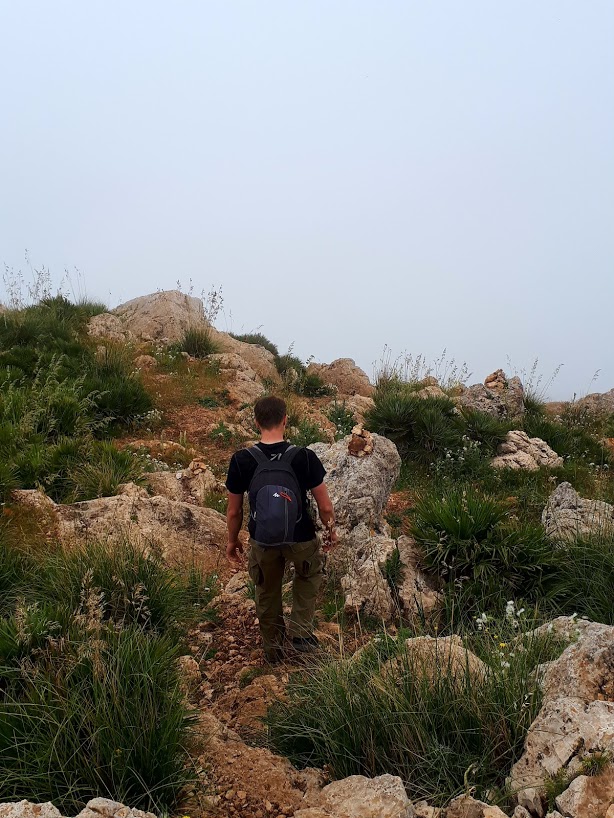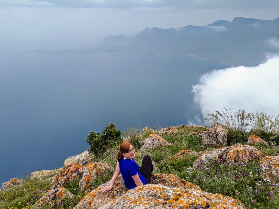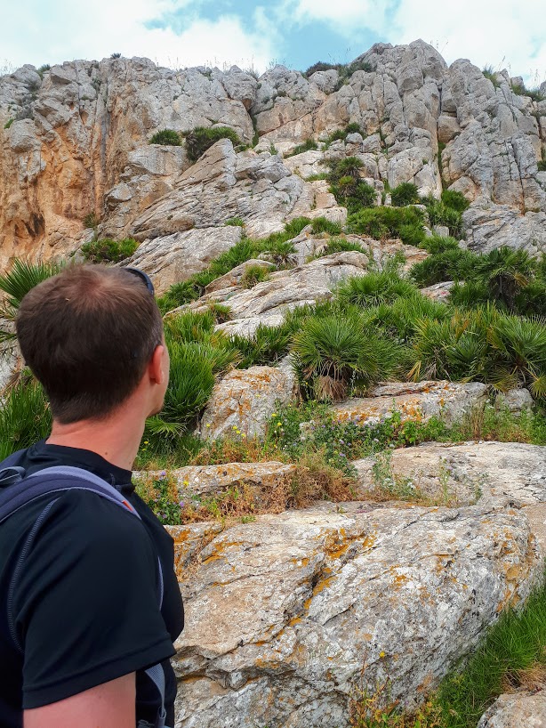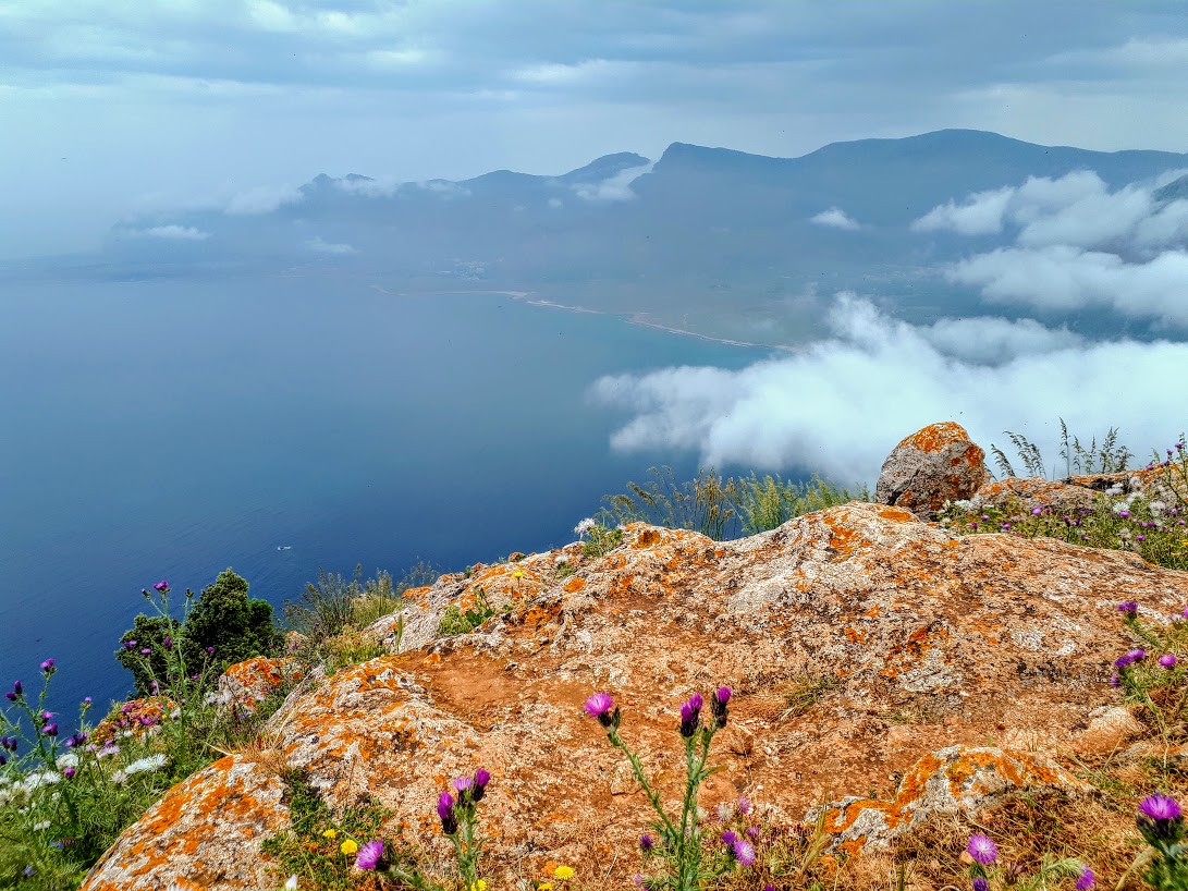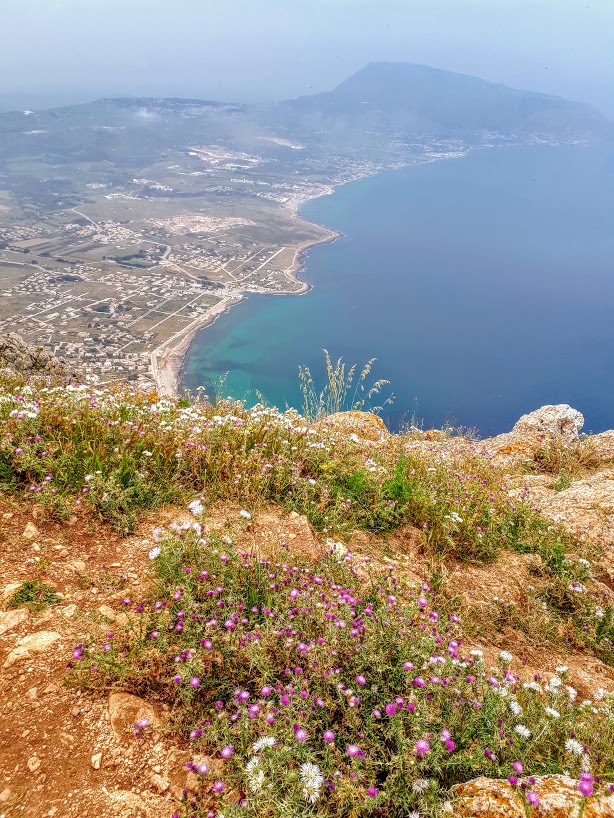 Początkowe podejście to czysta przyjemność – powoli zdobywamy wysokość, nie ma żadnych trudności technicznych, podziwiamy strome ściany Monte Cofano, błękit Morza Śródziemnego i okoliczne miasteczka z majaczącym daleko na horyzoncie, chowającym się co chwilę w chmurach Erice. Spotykamy też jedynych ludzi na trasie – przesympatycznych Czechów. Wymieniamy grzecznościowe ahoj!, gawędzimy chwilę po polsku i czesku, co zawsze wprawia mnie w dobry nastrój, aż w końcu Czesi puszczają nas przodem, bo podobno jesteśmy rychlejsi (ale koniec końców to oni pierwsi weszli na szczyt!).