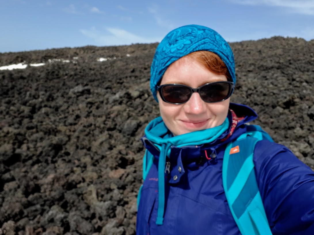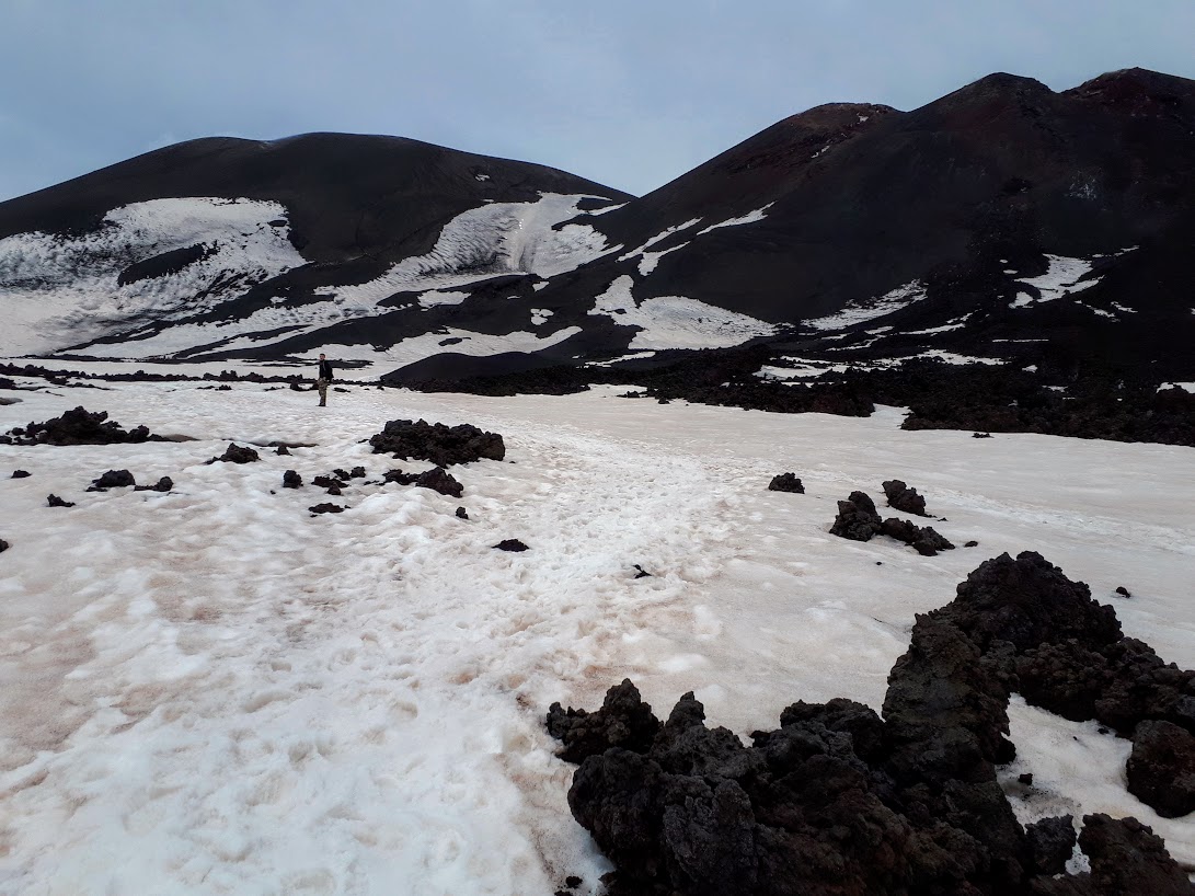 Pierwszy odcinek drogi nie napawa mnie optymizmem – nie bardzo widać, gdzie prowadzi szlak i czuję się mocno zdezorientowana. Dodatkowo idziemy po dość niebezpiecznym podłożu – zaschnięta lawa pod naszymi nogami jest ostra jak brzytwa i lepiej się tu nie potknąć. Częściowo idziemy też po śniegu, co stresuje mnie jeszcze bardziej. Pełno tu zagłębień i szczelin, dlatego staramy się iść wydeptaną w śniegu ścieżką, aby się gdzieś nie zapaść – skręcenie nogi na Etnie naprawdę nie jest nam potrzebne.