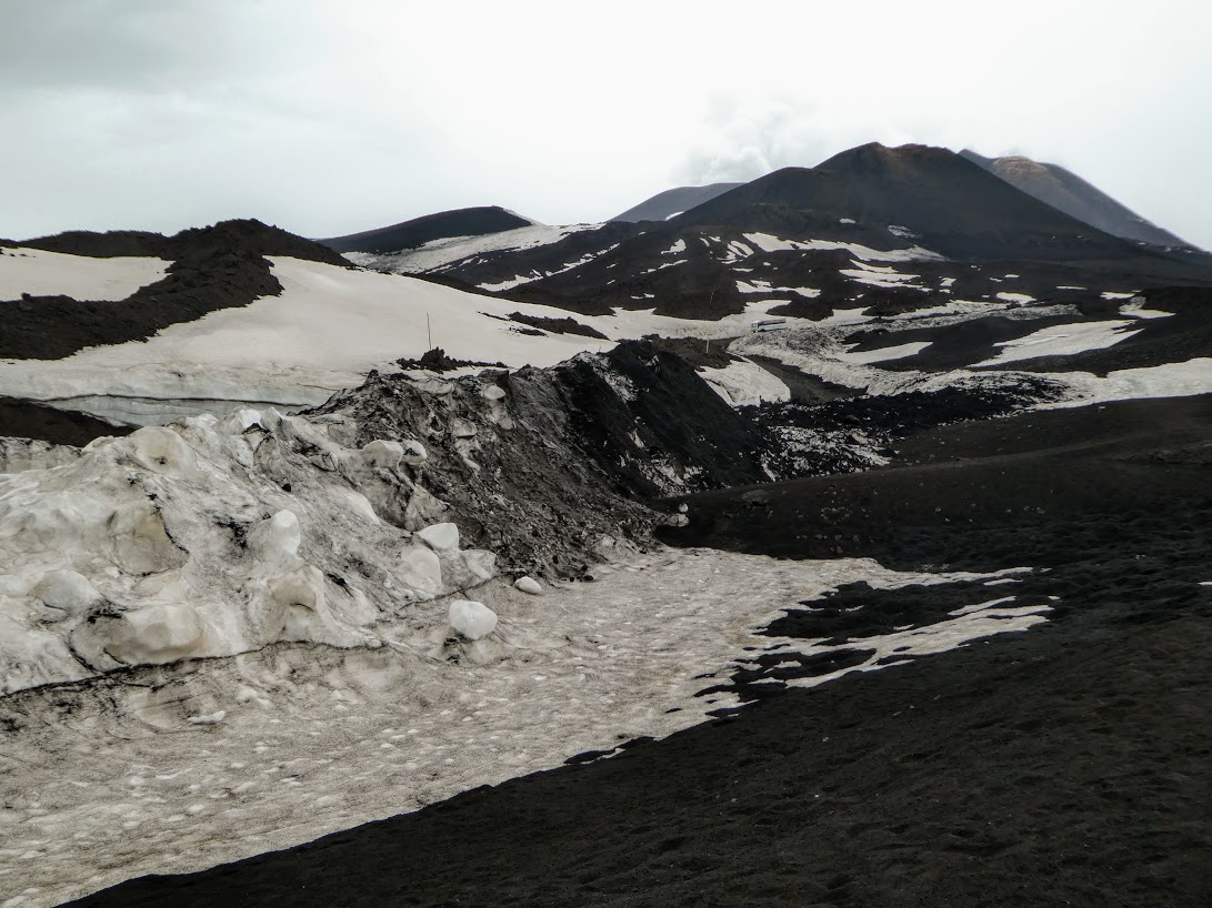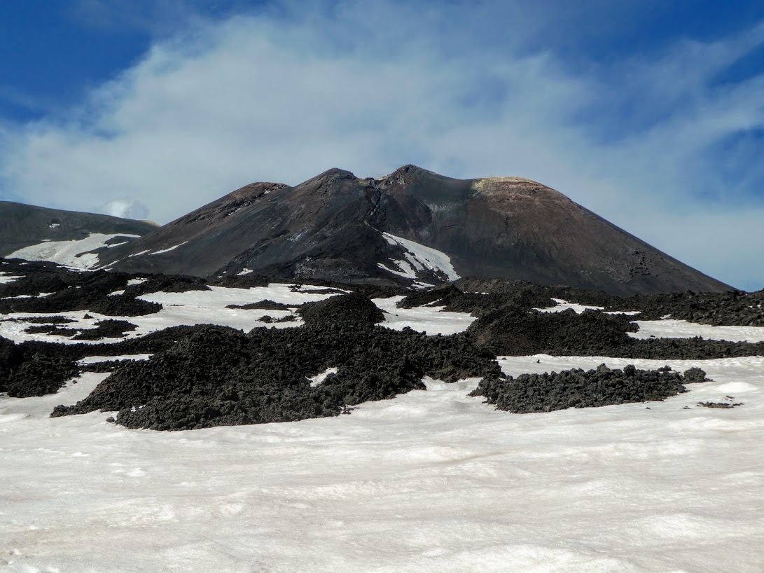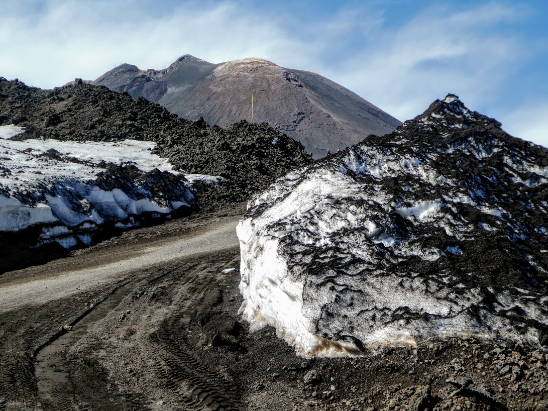 Sam dojazd z Katanii pod schronisko Rifugio Sapienza jest już ekscytujący. Wdrapujemy się (no dobrze, nasz niezawodny Fiat się wdrapuje – nie przypisujmy sobie zasług) po serpentynach poprowadzonych pośród skał i zaschniętej lawy. Przy schronisku zostawiamy auto na parkingu (6 euro) i nie tracąc czasu szukamy trasy w górę. Jest około 9.30 i mozół czas zacząć! I to z przytupem, bo pierwszy fragment podejścia jest wyjątkowo niesympatyczny. Jest dość stromo, a kamyki i żwir pod nogami wcale nie ułatwiają zadania – osuwają się i nie chcą współpracować. Otaczają nas czarno – białe krajobrazy (na początku maja na Etnie jest jeszcze sporo śniegu), życia wiele tu nie widać. Księżycowy mozół w niegościnnym terenie, o to właśnie chodziło! Podejście pod górną stację kolejki to ok. 600 metrów przewyższenia i powinno zająć ok. 1h50 min.