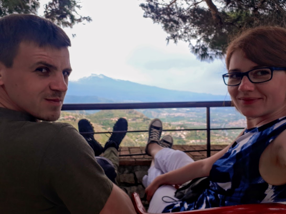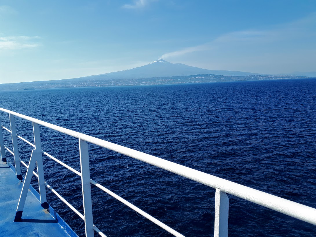Na Sycylię przypłynęłam promem z maltańskiej Valetty do Katanii. 8 – godzinny rejs wśród bezkresnego morza na początku wydawał się ekscytujący, szybko jednak zaczął mnie nużyć. No bo w którą stronę nie spojrzę – tam woda. Błękit nieba zlewa się z błękitem wody, lądu brak, w ogóle brak czegokolwiek poza wodą. Dlatego z radością powitałam majaczący na horyzoncie stożek, mój cel, majestatyczną Etnę!