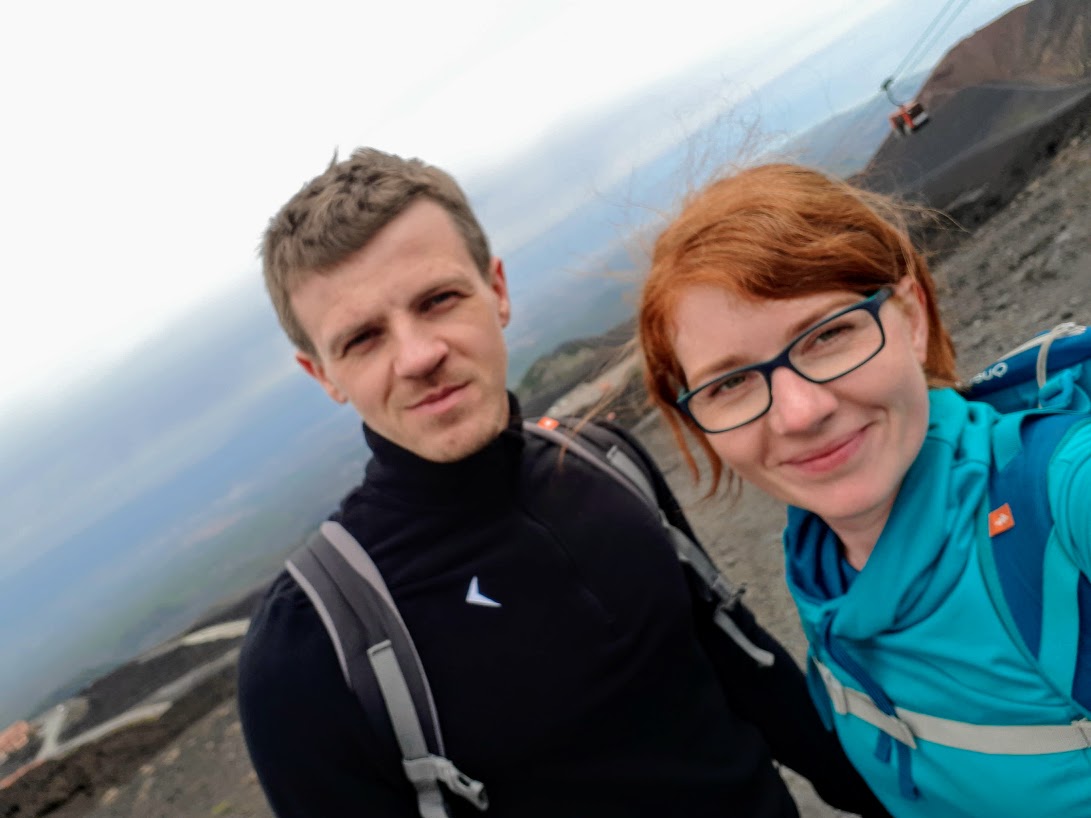 Nie jest już tak bardzo stromo jak na początku, ale – niespodzianka – wciąż pod górę! Poza nami wędruje trochę osób, ale zdecydowana większość wybiera mniej mozolne rozwiązanie i podjeżdża autobusami. My tymczasem podziwiamy prawdziwie księżycowy krajobraz, wypatrujemy ścieżki, a także walczymy z deszczem, bo zgodnie z niepisaną zasadą Musu Mozołu, w górach i na wulkanach musi padać. Choć trochę.