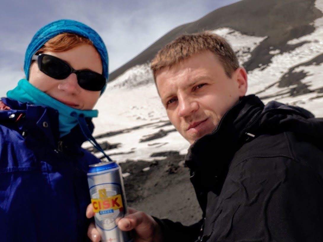 Uduszenie się na Etnie nie brzmiało zachęcająco, dlatego zachowując resztki zdrowego rozsądku odpuściliśmy. Nie dotarliśmy pod krater, zawróciliśmy z wysokości ok. 3100 m.n.p.m. Co ciekawe, podczas odwrotu natychmiast odzyskałam wigor i wróciły mi siły. Z pewnością pomogło też maltańskie piwo, które przypłynęło razem ze mną promem z Valetty i które wypiliśmy wspólnie nieco niżej, podziwiając niegościnne kratery Etny. Ten moment wspominam najmilej – byliśmy tam sami, dookoła tylko zastygła lawa i dymiące kratery Etny. Cisza, spokój i kosmiczny krajobraz. Już nawet mogę jakoś przełknąć to, że nie wlazłam tam, gdzie chciałam. Trudno, po prostu tu wrócę!