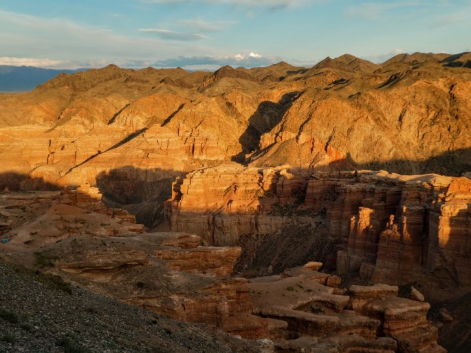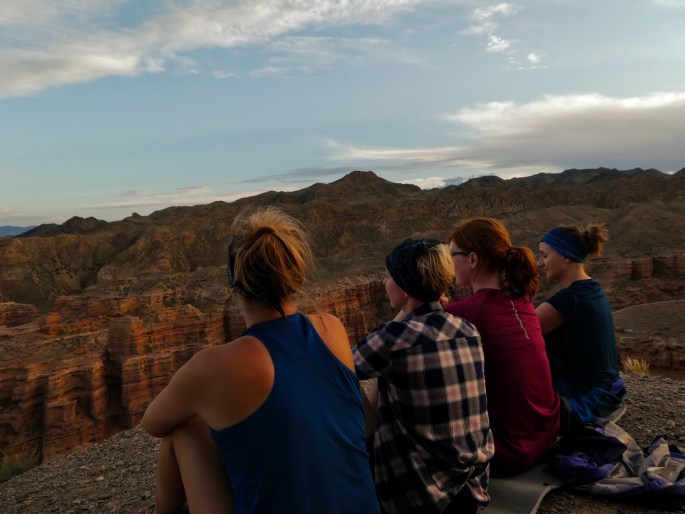 Przyjechałyśmy do kanionu z zamiarem spędzenia nocy w namiotach, po to, by móc podziwiać to piękne miejsce najpierw w promieniach zachodzącego, a następnie wschodzącego słońca. I to był strzał w dziesiątkę! Wieczorem, kiedy ostatnie promienie słoneczne oświetlają skały ciepłym światłem, kanion prezentuje się chyba najlepiej. Na dodatek mamy to miejsce praktycznie na wyłączność i możemy delektować się ciszą i spokojem siedząc gdzieś hen, daleko, w środku Kazachstanu.