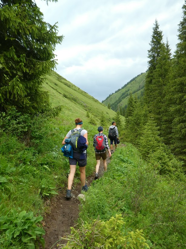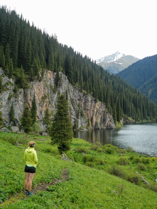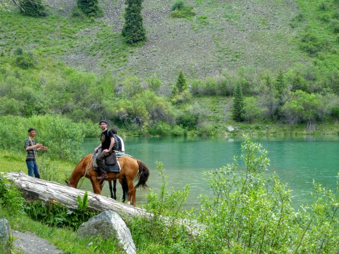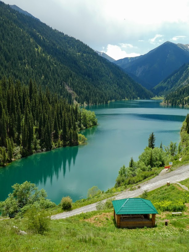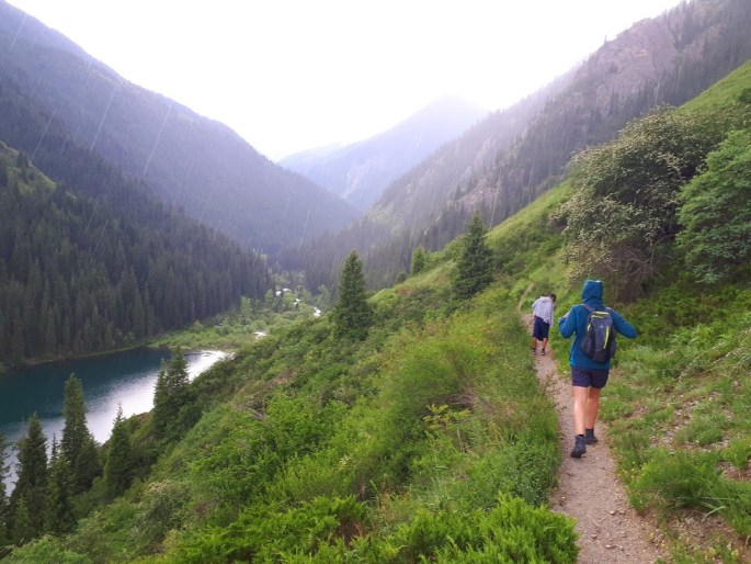 Docieramy w końcu do pierwszego z trzech jezior, leżącego na wysokości ok. 1800 m.n.p.m. Ma ono około 80 metrów głębokości, jest długie na kilometr i szerokie na około 400 metrów. Można do niego dojechać samochodem, ale sam pobyt nad pierwszym jeziorem to dla nas zdecydowanie za mało! Decydujemy się więc na trekking do drugiego jeziora, położonego na wysokości ok. 2200 m.n.p.m. Trzecie z jezior znajduje się już w strefie przygranicznej i zgodnie z informacjami uzyskanymi od miejscowych, nie da się go (legalnie) odwiedzić. Ignorujemy fakt, że nad naszymi głowami zbierają się ciemne chmury i wszystko wskazuje na to, że wkrótce zacznie padać i ruszamy. Nasz kierowca Nurzhan idzie z nami, co zdecydowanie dodaje nam otuchy.