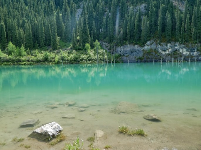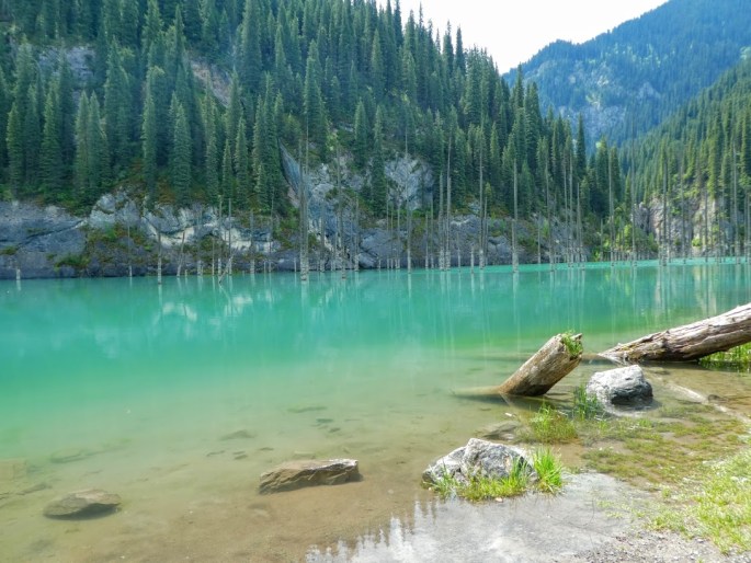 Tak naprawdę wszystkie te opowieści o podwodnym lesie są trochę naciągane, bo z wody wystają co najwyżej nagie pnie, ale nie zmienia to faktu, że całość wygląda intrygująco. Jezioro Kaindy powstało w wyniku trzęsienia ziemi w roku 1911. Nie jest duże – ma zaledwie 400 metrów długości i ok. 30 głębokości, ale trudno nie zachwycić się pięknym, lazurowym kolorem wody. Nie polecam kąpieli, bo woda ma zaledwie 6 stopni. Dobrym pomysłem jest za to spacer dookoła jeziora i podziwianie tego, co pozostało z lasu sosnowego