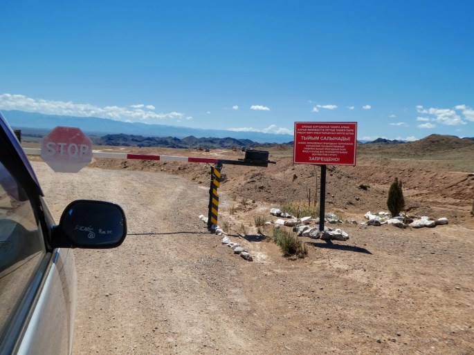 Dojazd w okolice kanionu względnie przyzwoitą drogą A-351 zajmuje prawie 3 godziny i jest to jedynie przedsmak tego, co czeka nas dalej. Do pokonania zostaje jeszcze kilka kilometrów po bezdrożach, wśród wszechobecnego pyłu i piachu. Powoli dotaczamy się się jednak do bramy wjazdowej do kanionu, gdzie Nurzhan płaci za wstęp (750 tenge/os. i 200 tenge za samochód, czyli ok. 8 zł i 2 zł). Następnie parkujemy przy turystycznych wiatach, wysiadamy z samochodu, zaliczamy pierwszy, szybki udar słoneczny i ruszamy na spotkanie z kanionem!