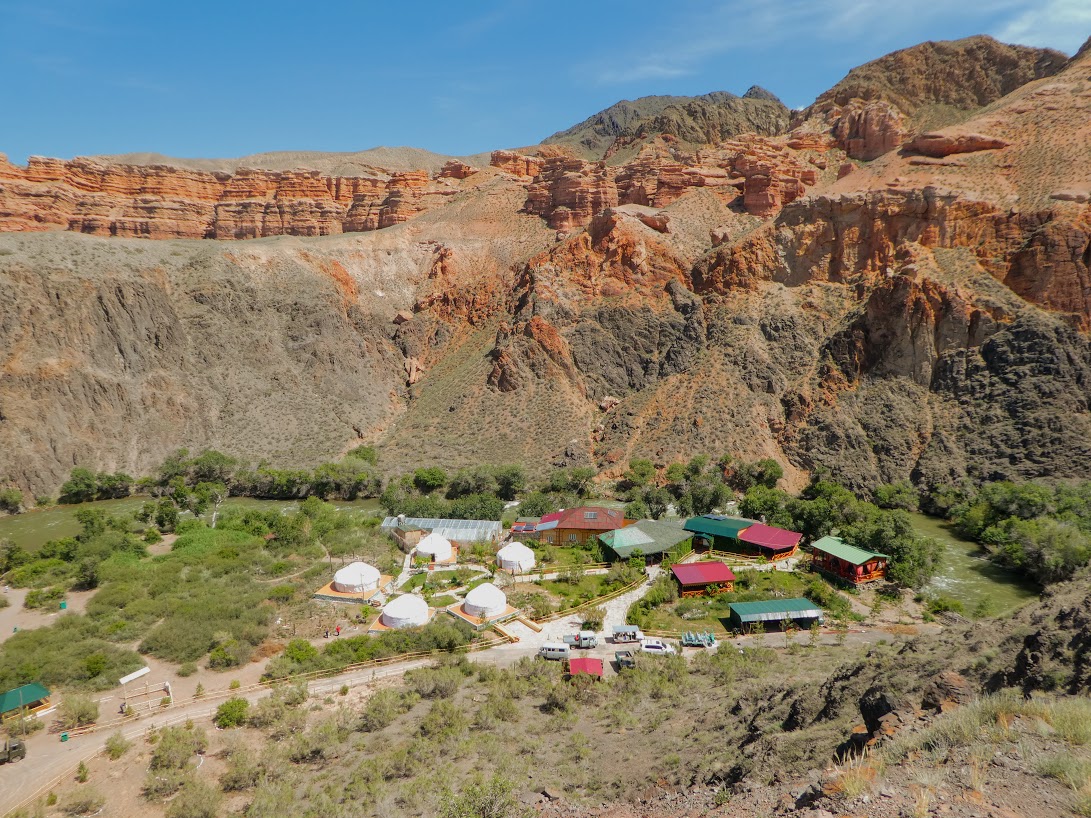 Widok z góry na „cywilizację” w kanionie – bar, jurty, domki do wynajęcia.