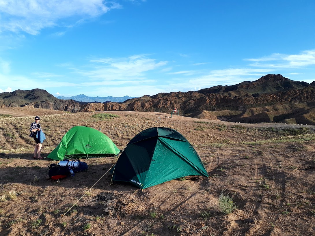Zastanawiałyśmy się, gdzie rozbić namioty – czy zrobić to na dnie kanionu czy gdzieś na górze. Wygrała opcja „góry”, gdyż chciałyśmy mieć lepszy widok na zachodzące i wschodzące słońce. Owszem, przeszła nam gdzieś tam przez głowę myśl, że na górze może trochę wiać, ale postanowiłyśmy ją zignorować. No i wyobraźcie sobie, że w nocy wiało i to dość konkretnie. Na dodatek w oddali przez pół nocy się błyskało, a my miałyśmy już całkiem precyzyjną wizję nawałnicy, która już za chwilę przetoczy się nad naszymi głowami. Co prawda jakieś 15 minut drogi od naszych namiotów stał zaparkowany samochód z naszym kierowcą, Nurzhanem, ale przyznaję, że nakręciłyśmy spiralę paranoi w sposób wzorcowy. Na dodatek jedna z nas zidentyfikowała dziwne zwierzę siedzące w pobliżu namiotów (o czym poinformowała nas jednak dopiero nad ranem). Prawda jest taka, że w trakcie tej mojej wymarzonej nocy w kanionie Szaryńskim prawie nie zmrużyłam oka i rano wstałam totalnie zmaltretowana (w sumie wszystkie wstałyśmy). Zadziwiająco sprawnie ogarnęłyśmy namioty, zjadłyśmy śniadanie i ruszyłyśmy do samochodu, bo kolejnym przystankiem w trakcie kazachskich mozołów miały być jeziora Kolsai.