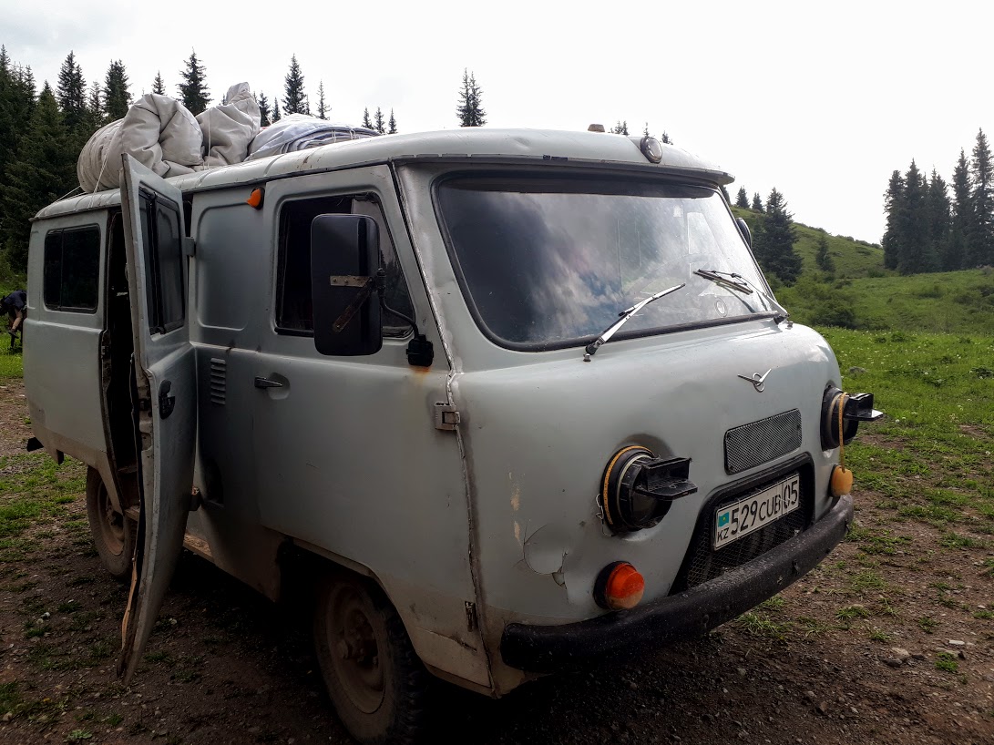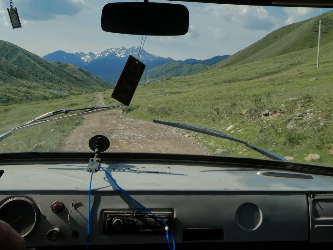 Przygoda zaczyna się na długo zanim docieramy do jeziora, bo czeka nas przejażdżka najprawdziwszym radzieckim uazem! Auto zostało w jakiś sposób zorganizowane – ktoś gdzieś zadzwonił , ktoś komuś przekazał, ktoś z kimś uzgodnił i rano pod domem stał niezniszczalny uaz (za przejazd płaciłyśmy dodatkowo, nie pamiętam niestety ile). Było dużo zabawy, zwłaszcza kiedy pokonywałyśmy całkiem żwawo płynący strumyk. Trzeba było mocno się trzymać, bo auto podskakiwało na każdym wertepie. Do przejechania miałyśmy 12 niezapomnianych kilometrów, potem jeszcze krótki spacer i w końcu przywitałyśmy się z jeziorem Kaindy.