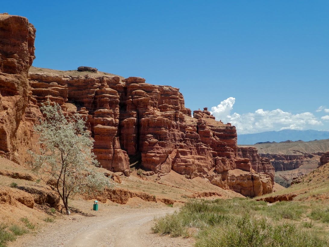 Dojazd w okolice kanionu względnie przyzwoitą drogą A-351 zajmuje prawie 3 godziny i jest to jedynie przedsmak tego, co czeka nas dalej. Do pokonania zostaje jeszcze kilka kilometrów po bezdrożach, wśród wszechobecnego pyłu i piachu. Powoli dotaczamy się się jednak do bramy wjazdowej do kanionu, gdzie Nurzhan płaci za wstęp (750 tenge/os. i 200 tenge za samochód, czyli ok. 8 zł i 2 zł). Następnie parkujemy przy turystycznych wiatach, wysiadamy z samochodu, zaliczamy pierwszy, szybki udar słoneczny i ruszamy na spotkanie z kanionem!