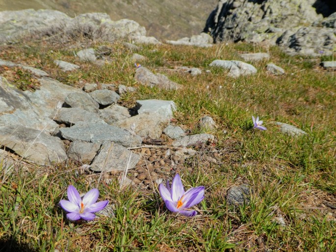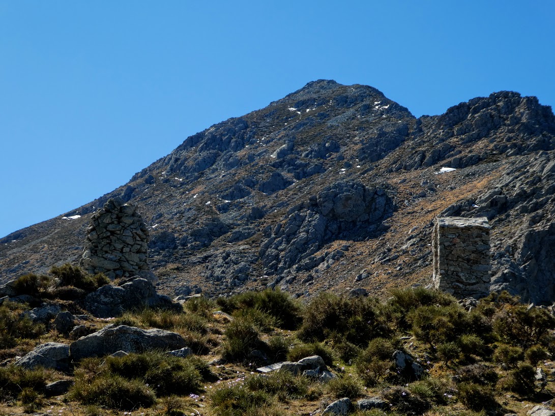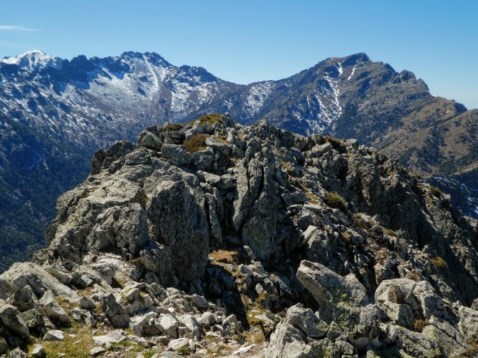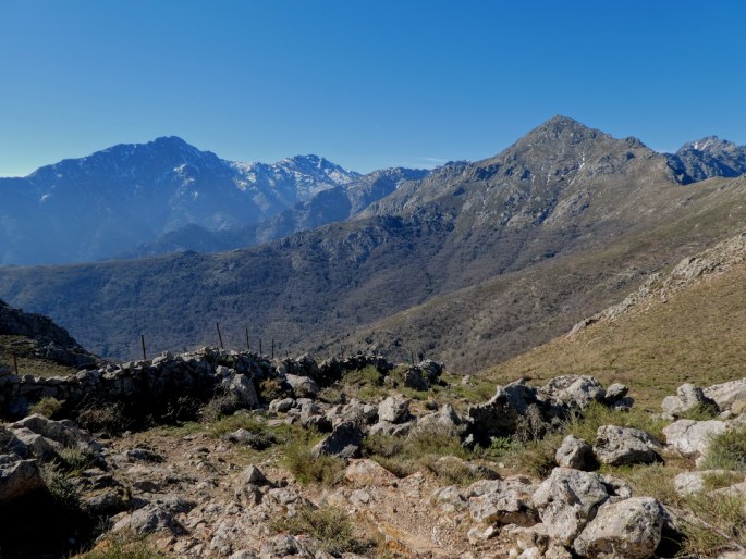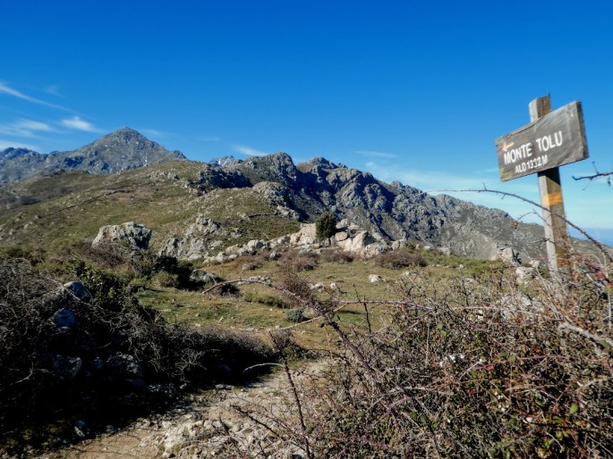 Wkrótce docieramy do przełęczy Bocca di croce d’Olu, gdzie przecinamy szlak łączący Ile Rousse z Corte. Idziemy dalej i już po kilkunastu minutach okazuje się, że szlak jest bardziej urozmaicony niż ten, którym szliśmy w lutym. Pojawiają się niewielkie trudności techniczne – trzeba używać rąk, żeby wdrapywać się na wielkie kamienie. Szlak aż do góry Monte Tolu, którą mijamy po drodze, jest dobrze oznakowany. Czekają na nas też rozległe panoramy – można wypatrzeć Calvi i Ile Rousse, a także przyjrzeć się z góry miasteczku Speloncato.