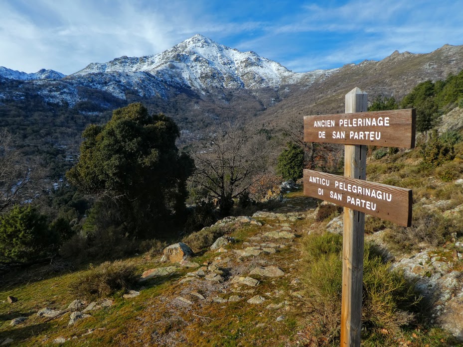 San Parteo to szczyt o wysokości 1680 m.n.p.m., leżący w masywie Monte Cinto w północno – zachodniej Korsyce. Nie jest to pagór ani najwyższy, ani szczególnie znany, na dodatek znajduje się dość daleko od słynnego GR20, jednym słowem – wymarzony cel dla Musu Mozołu! Trzeba przyznać, że piramidalny kształt tej górki może się podobać. Mi spodobał się do tego stopnia, że kiedy zobaczyłam zdjęcie w internecie, od razu stwierdziłam, że chcę wleźć na ten stożek. Do roku 1935 w każdy poniedziałek wielkanocny pod szczyt San Parteo wyruszała procesja, a od roku 2007 ta tradycja została wznowiona, tyle, że odbywa się ona w ostatnią niedzielę lipca. Na wierzchołek prowadzi kilka szlaków, a my na własnej skórze przetestowaliśmy dwa z nich, które opisuję poniżej.