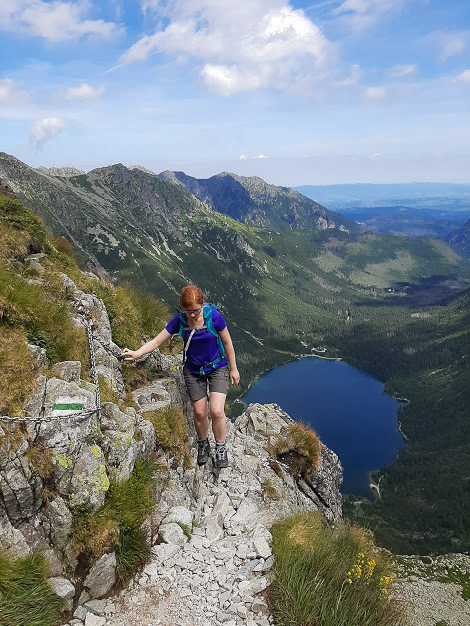 Jestem z tych, dla których but w góry to but za kostkę 🙂 Dlatego też przy wyborze modelu odpowiedniego dla moich potrzeb kierowałam się właśnie wysokością cholewki, a drugim najistotniejszym czynnikiem była membrana Gore-Tex. Jednym słowem – miało być sucho, bez żadnych przykrych niespodzianek w postaci mokrych butów, bo przeszłam przez kałużę! Do tego podeszwa Vibram, żeby nie ślizgać się po skałach, niech to wszystko jeszcze jakoś ładnie wygląda i proszę bardzo – znalazłam model butów idealny dla siebie! Chiruca Telma GTX, kolor niebieski, rozmiar 40.