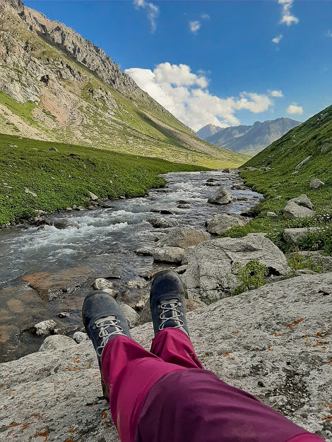 W Kirgistanie przedreptaliśmy po górskich szlakach jakieś 100 kilometrów. Czasem trzeba była przejść przez jakiś strumyk (a czasem przejechać konno!), innym razem pobrodzić w błocie. W trakcie trekkingu z Jergalanu do Altyn-Araszanu w pewnym momencie świat uznał, że zasługujemy na porządną ulewę, dlatego przez 3 dni lało. Muszę przyznać, że buty mnie nie zawiodły! Było sucho i komfortowo, dodatkowo moim zdaniem ten model nieźle oddycha – stopa się w nim nie gotuje. Przyznaję, że kiedy dotarliśmy w końcu w strugach deszczu do celu, buty miałam jednak w środku nieco wilgotne, ale woda dostawała się do nich od góry, przesiąkając przez spodnie (bez membrany, bo po co komu takie wynalazki…). W Kirgistanie buty Chiruca nie zawiodły mnie ani razu i na dodatek udało nam się do siebie dopasować na tyle, że nic nie obcierało ani nie powodowało dyskomfortu. W kanionie Skazka miałam okazję połazić w butkach po skale i nie mam zastrzeżeń do przyczepności – podeszwa nie ślizgała się po podłożu.
