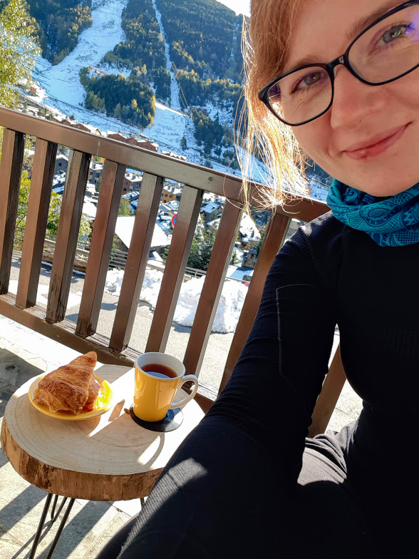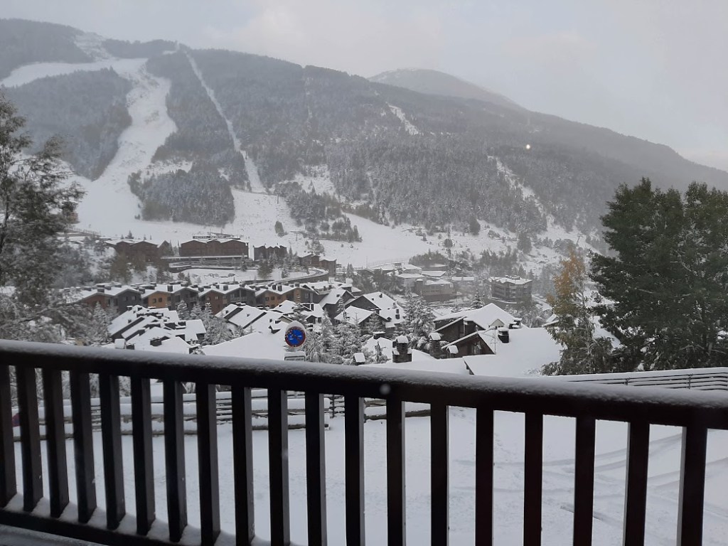 Widok z balkonu był podstawowym kryterium, jakie brałam pod uwagę przy wyborze naszej kwatery. Bo to, że balkon być musiał, było oczywiste. Wygrał balkon w El Tarter i tutaj też mieszkaliśmy przez ponad półtora tygodnia. Październikowe słońce potrafi być zaskakująco mocne, tak więc wygrzewaliśmy się w ciepełku podziwiając zaśnieżone szczyty. Czasem tylko przychodziła prawdziwa zima i trzeba było schować się do środka. Niby zwykły balkon, a pierwszy andorski zachwyt już na koncie!