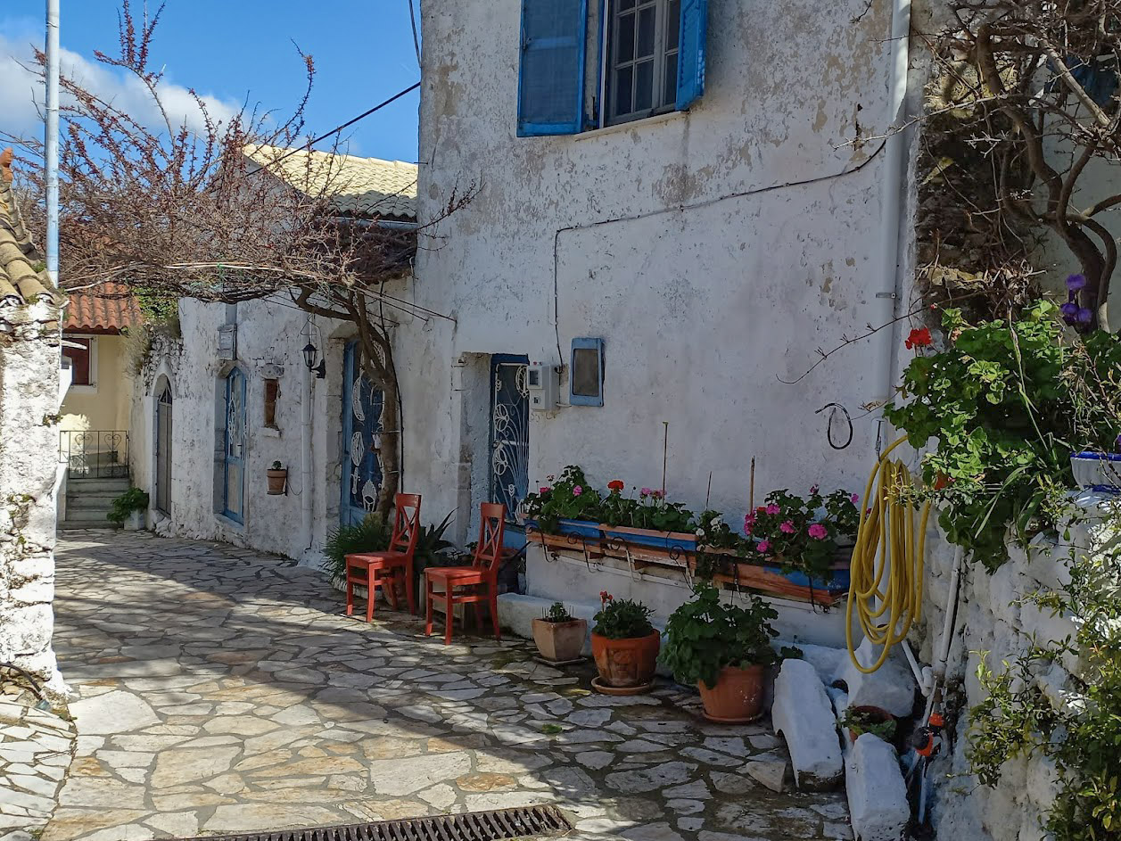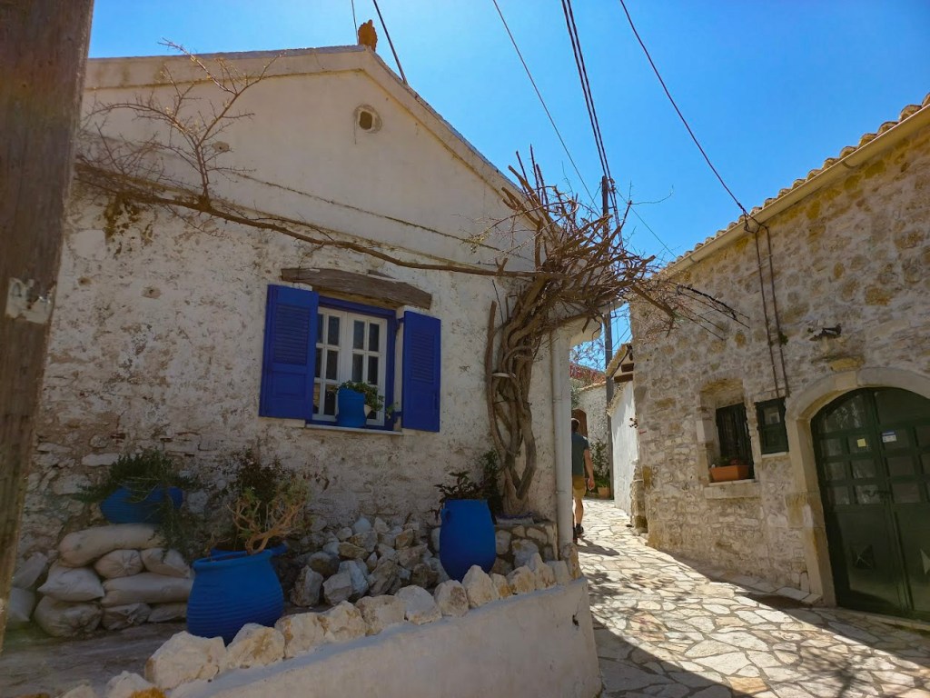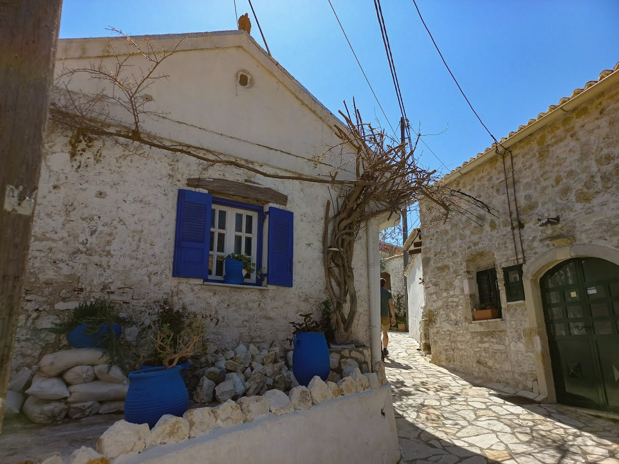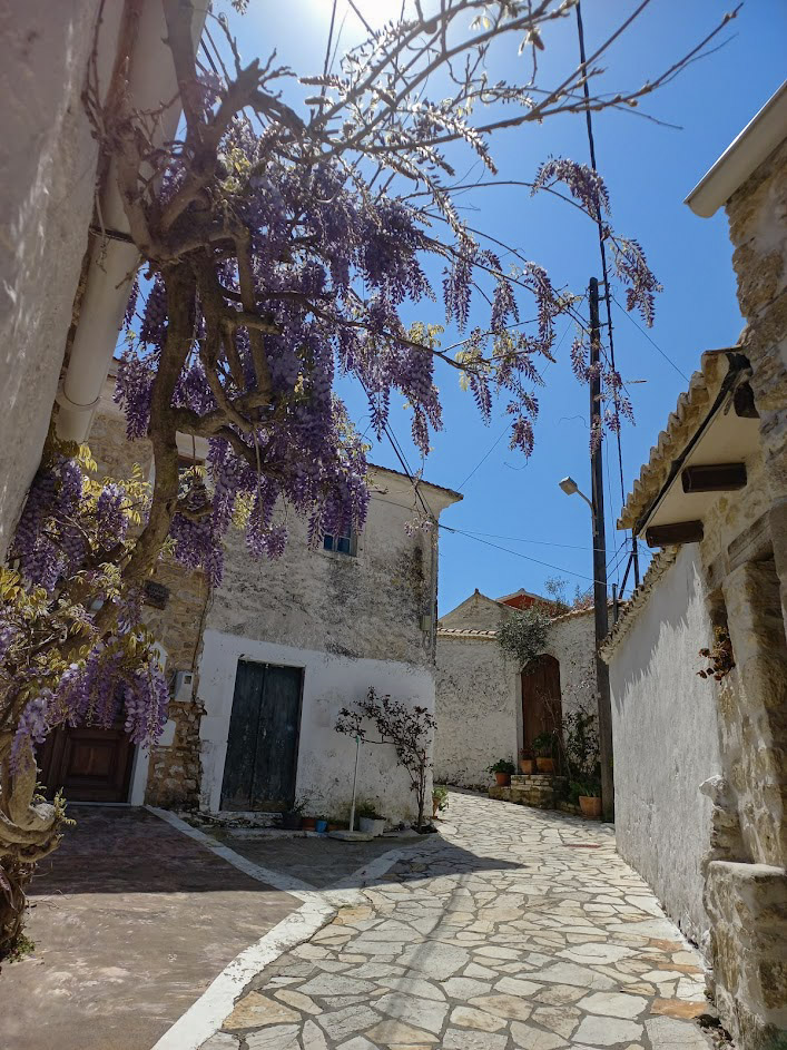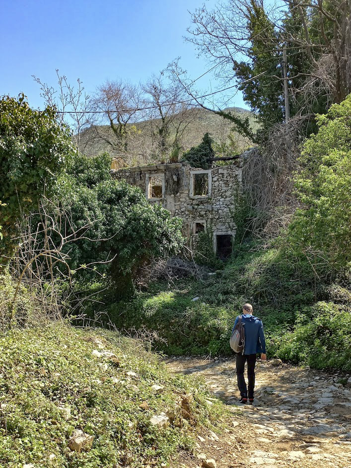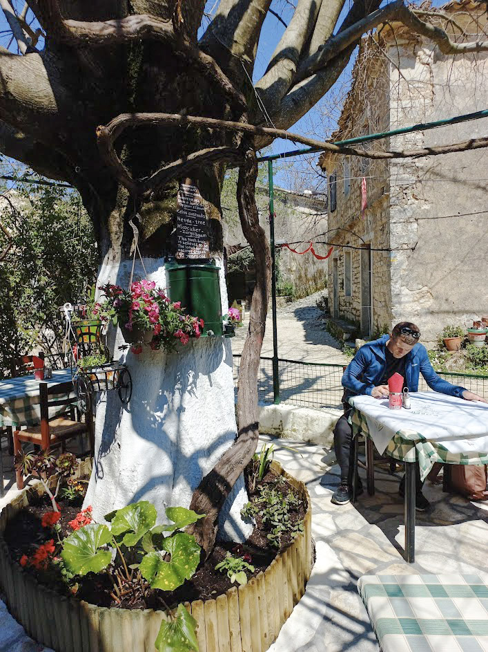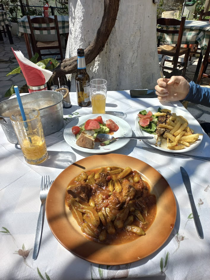 Corfu Trail doprowadza nas do osady Palia Parythia (400 m.n.p.m.). To podobno jedna z najlepiej zachowanych typowych wiosek Korfu. W tej chwili nie ma stałych mieszkańców, ale znajduje się tu mnóstwo klimatycznych kawiarni i tawern. Kiedy już pobłąkaliśmy się pomiędzy starymi zabudowaniami, usiedliśmy w jednej z knajp i zjedliśmy przepyszne, greckie jedzenie. Zasłużona nagroda za mozół!