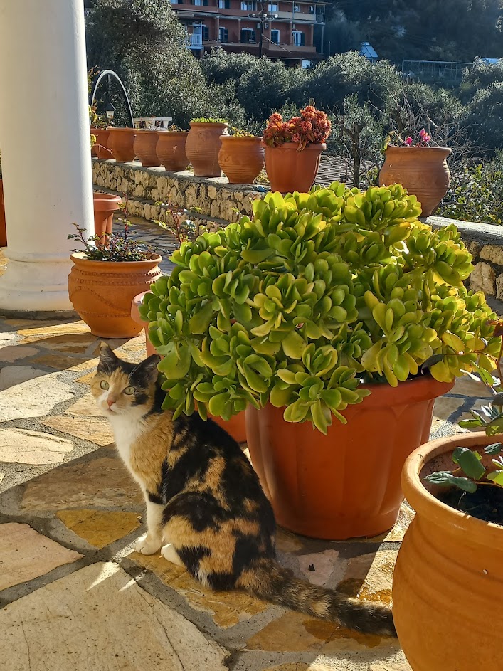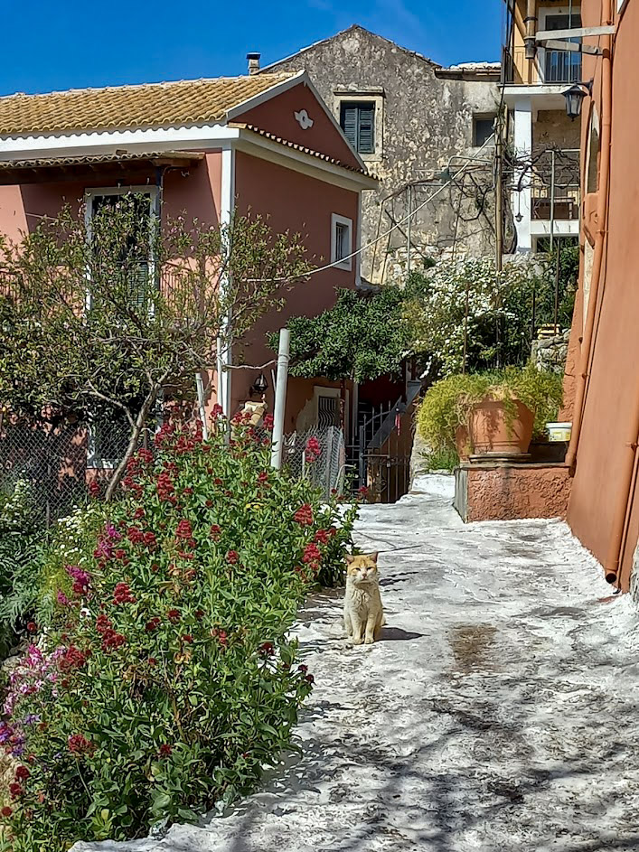 Po niecałej godzinie marszu ujrzeliśmy pierwsze zabudowania… i pierwsze koty, a było ich tu całe stado. Trzeba przyznać, że Lakones umie się sprzedać. Sami rozumiecie, jeśli tu i tam czytasz, że właśnie stąd roztacza się jeden z najpiękniejszych widoków na Korfu, to przyzwoitość nakazuje, aby do Lakones nie tylko zajrzeć, ale także wypić kawę na jednym z tarasów z całkiem niebrzydką panoramą.