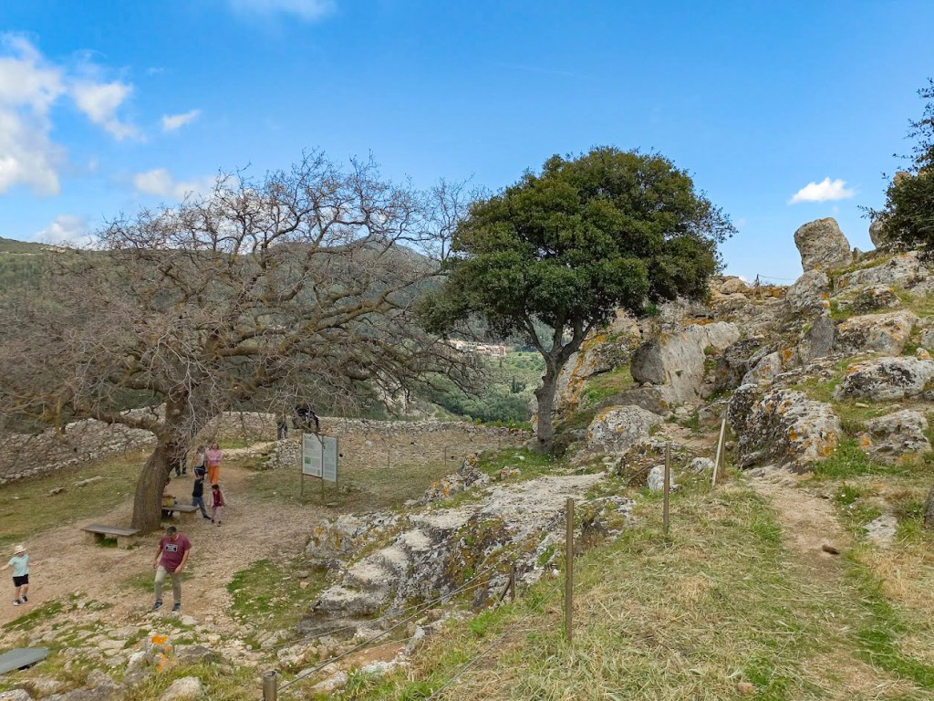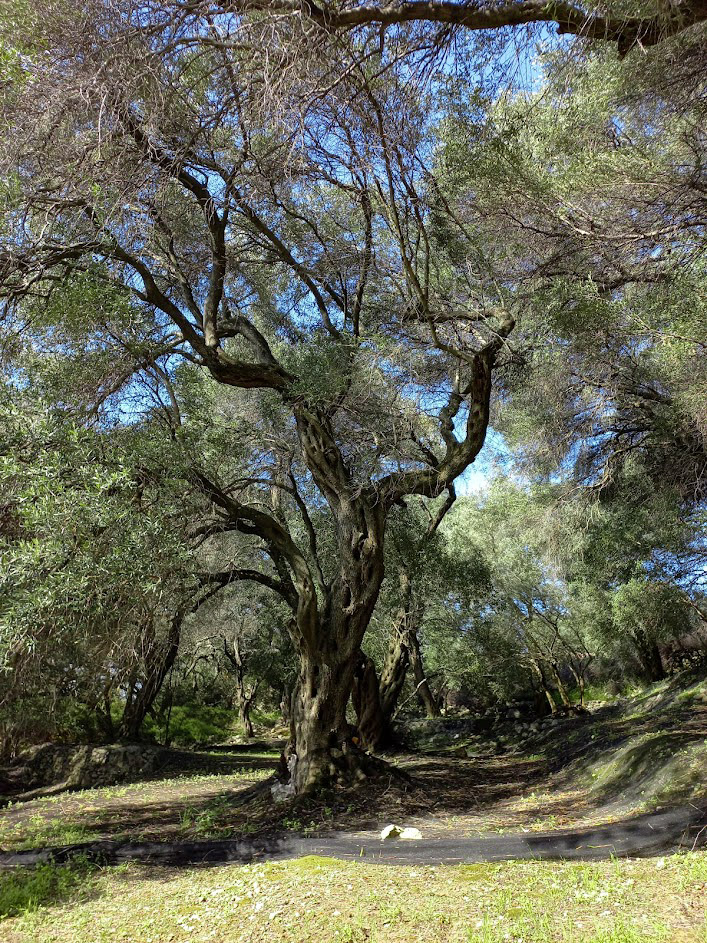 Dalej wędrujemy ulicą, a kiedy kończą się zabudowania osady, podziwiamy już tylko błękitne zatoki Paleokastritsy. Mijamy jeszcze kilka pustych o tej porze roku kawiarni i restauracji, i odbijamy w lewo, do gaju oliwnego. Zacienionymi ścieżkami docieramy do ruin twierdzy Angelokastro.